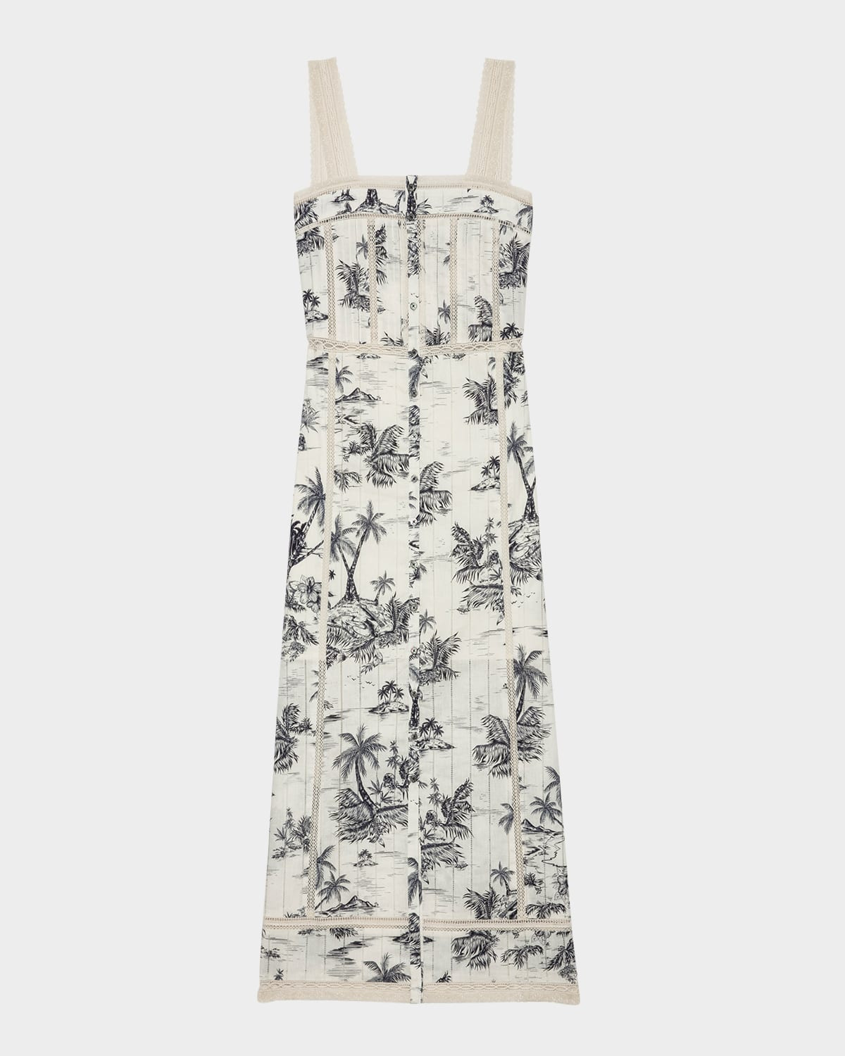 - Zadig & Voltaire "Renaid" dress featured in Tropical Island print with multi lace inset detailing throughout - Square neckline - Sleeveless - Hem falls below the knee - A-line silhouette - Button front closure - Cotton - Machine wash cold - Imported