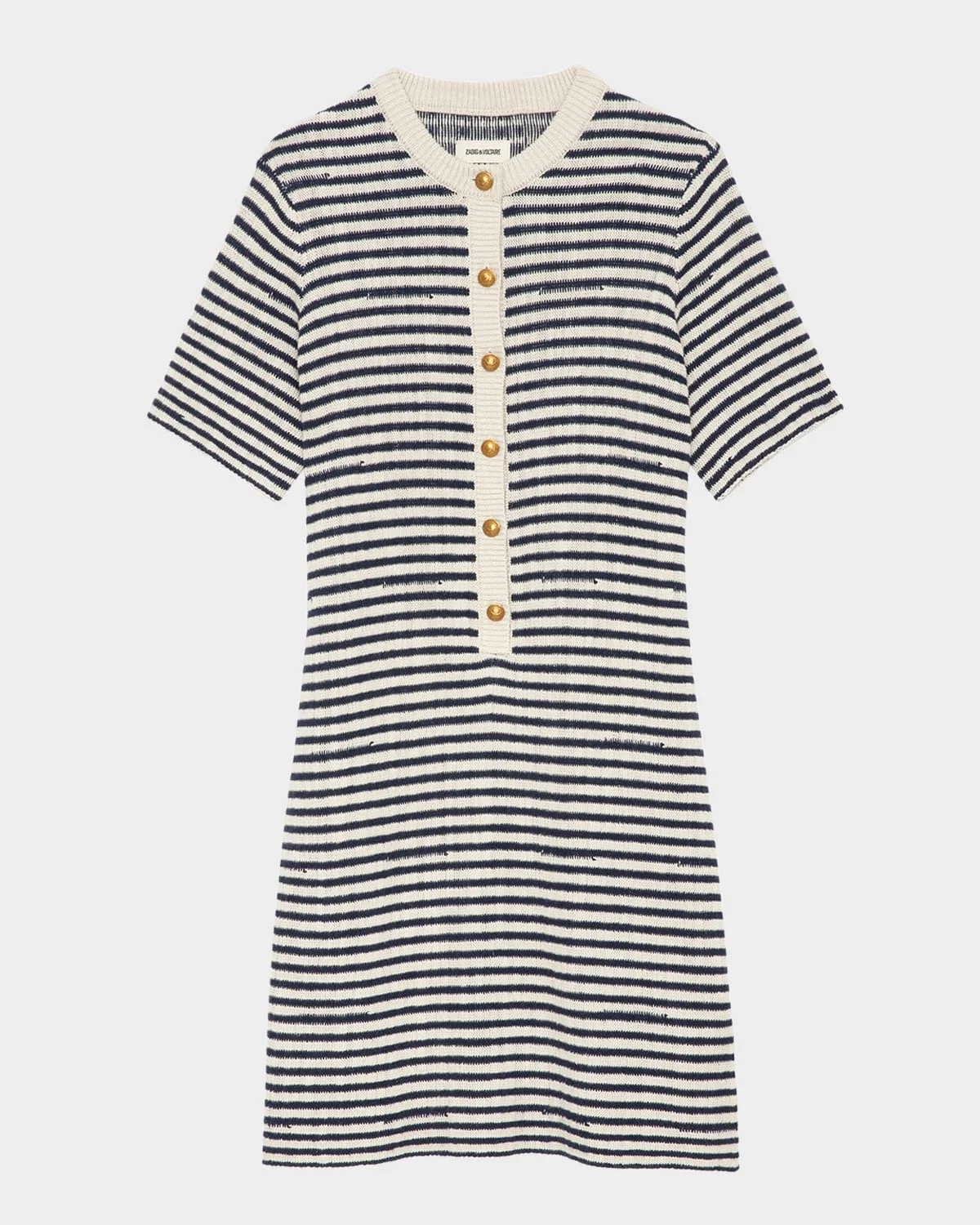- Zadig & Voltaire "Tahoe" sailor-inspired dress crafted in a striped print and accented with golden embossed-dome buttons - V neckline; partial button front - Short sleeves - Hem falls above the knee - A-line silhouette - Slipover style - Cotton/viscose/linen - Machine wash cold - Imported
