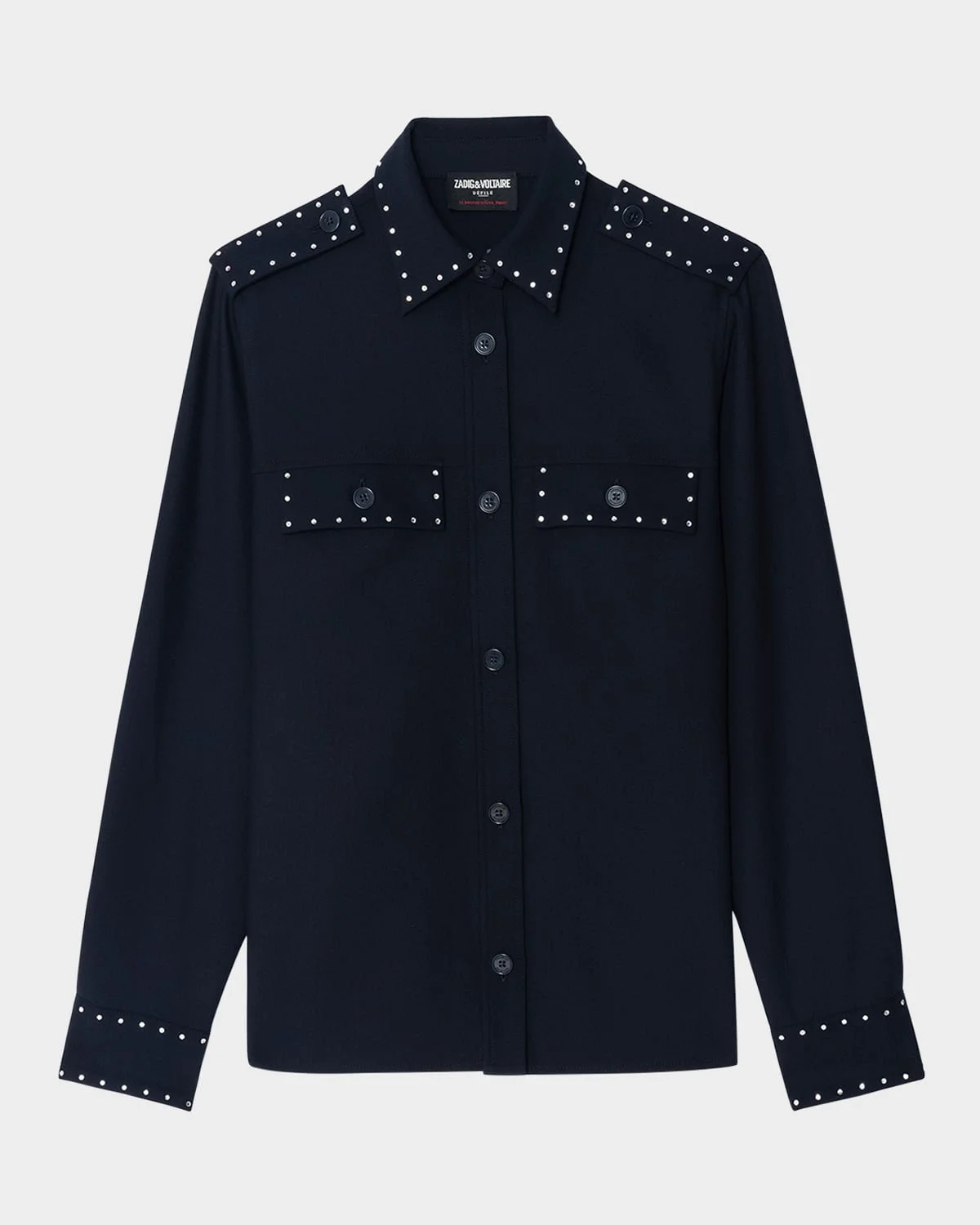 - Zadig & Voltaire "Taskam" tailored overshirt with rhinestone embellishments - Classic collar; button front - Shoulder epaulettes - Long sleeves; button cuffs - Chest flap pockets - Relaxed fit - Hip length - Polyester/viscose/elastane - Dry clean - Imported