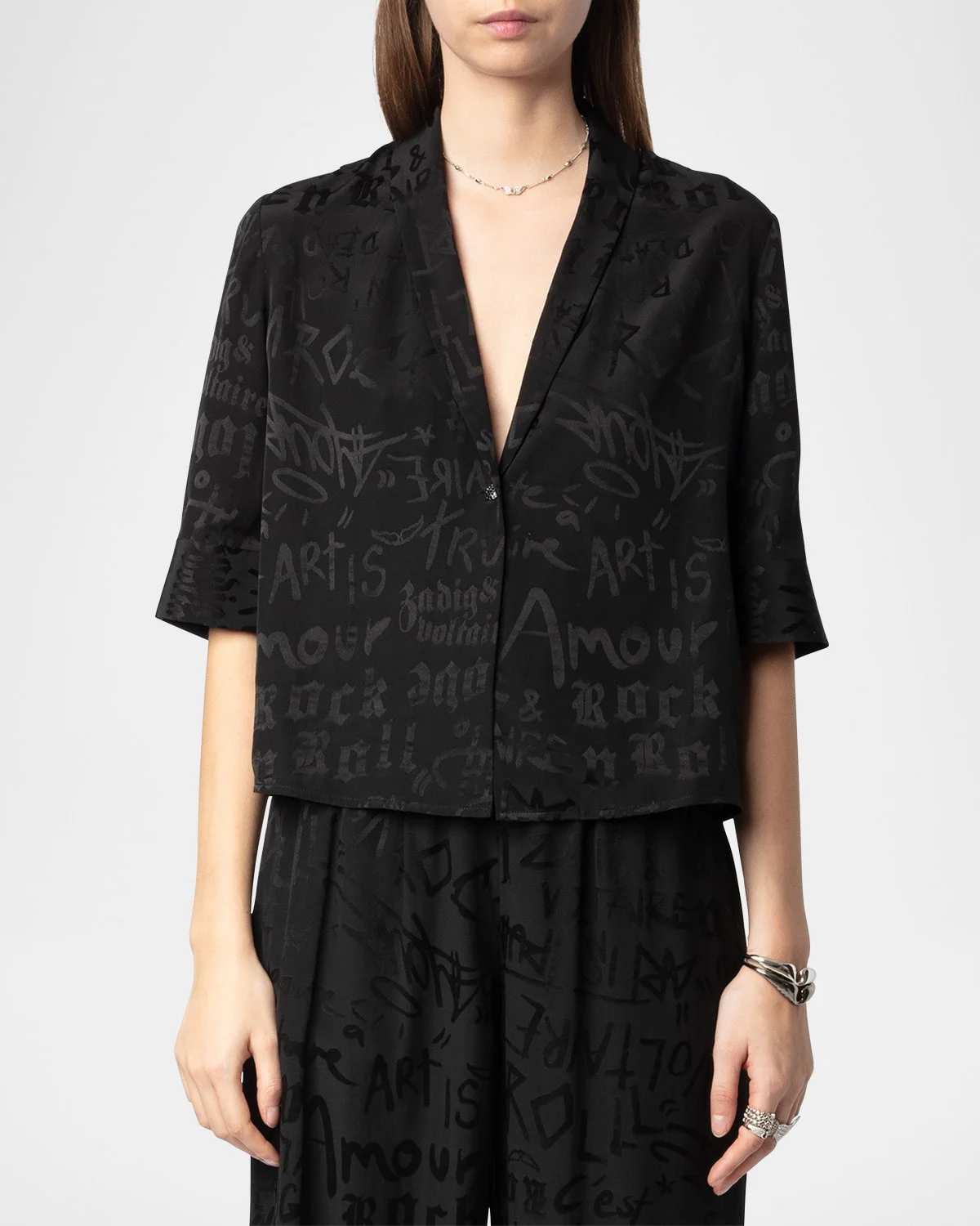 - Zadig & Voltaire "Telmos" blouse with allover Manifesto print - Collared V neckline - Elbow-length sleeves; button cuffs - Hip length - Relaxed fit - Button front closure - Silk - Dry clean - Imported