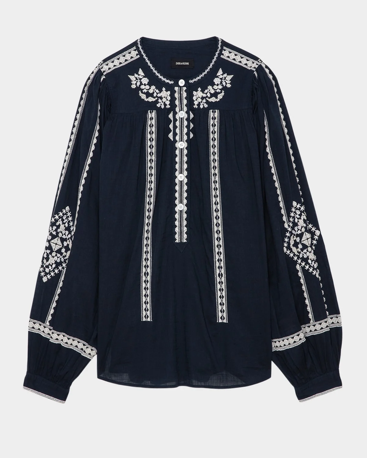- Zadig & Voltaire "Tigy" blouse is detailed with intricate kozak embroidery throughout and framed with voluminous sleeves - Collarless neckline - Long balloon sleeves; button cuffs - Oversized fit - Hip length - Button front closure - Cotton - Machine wash cold - Imported