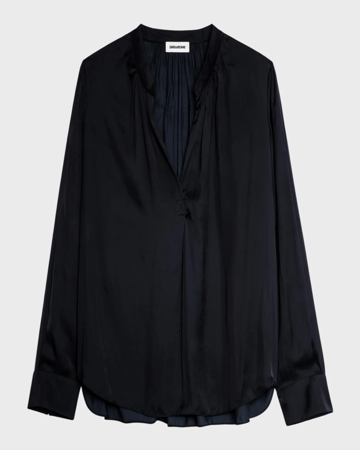 Zadig & Voltaire "Tink" flowing tunic blouse crafted from a light, satiny fabric with gathered detailing V neckline Long sleeves; button cuffs Hip length Relaxed fit Slipover style & nbsp; Polyester Machine wash cold Imported Model is 5 & apos;10"/177cm.