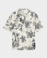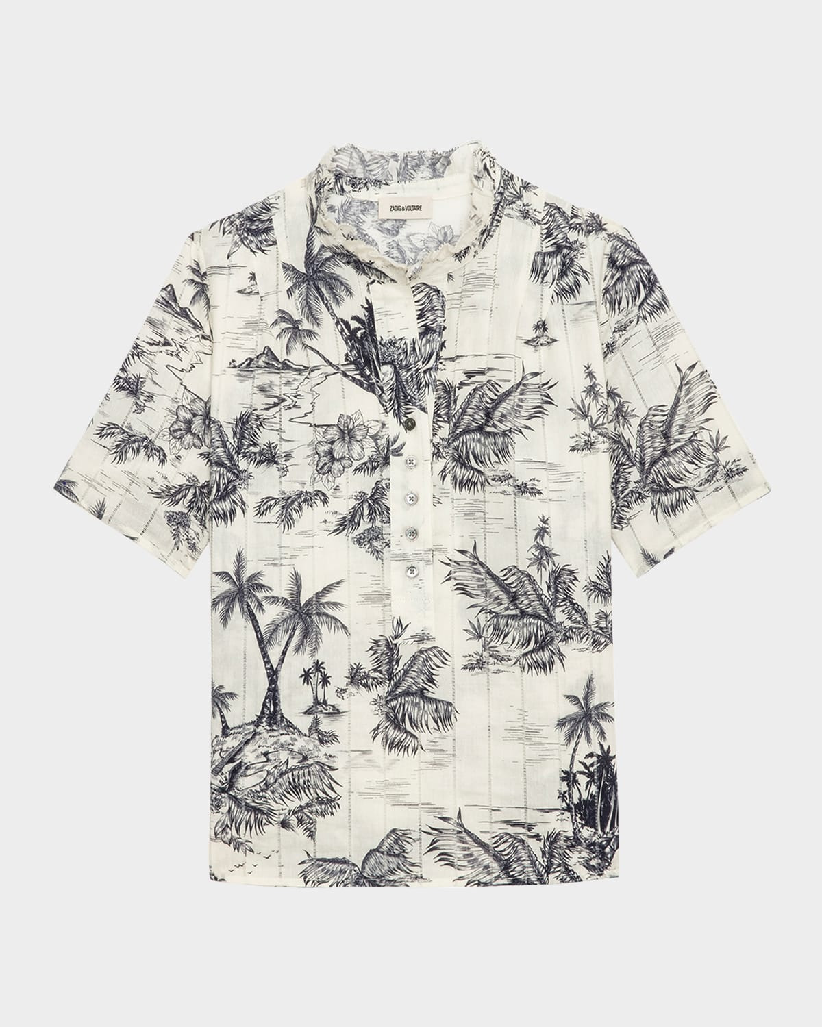 - Zadig & Voltaire "Topher" blouse featured in Tropical Island print with stretch ladder inset detailing throughout - Ruffled high neckline; partial button front - Short sleeves - Relaxed fit - Hip length - Slipover style - Cotton - Machine wash cold - Imported