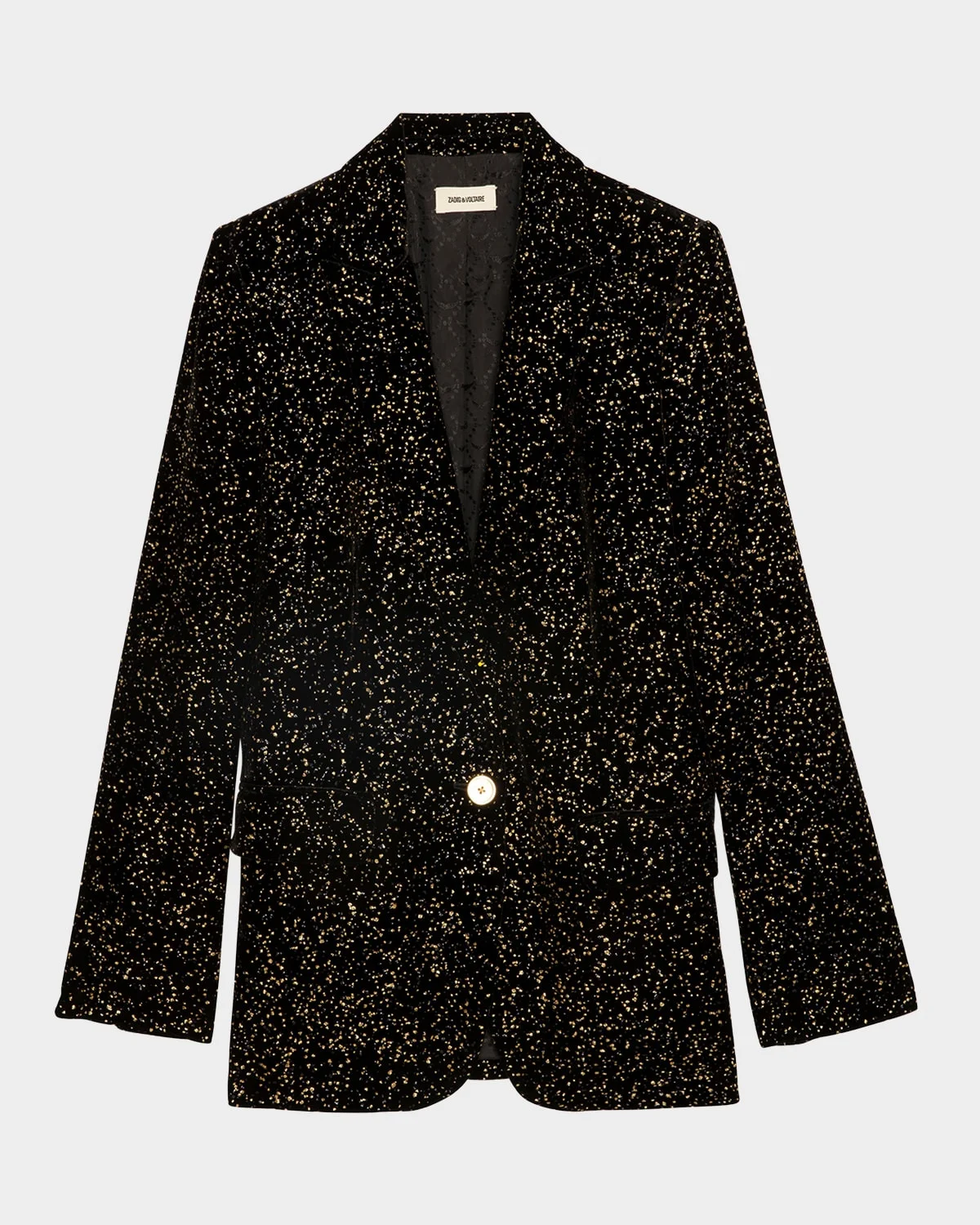 Zadig amp; Voltaire "Valse" velvet blazer with gold sequin motifs Tailored collar; singlebreasted front Padded shoulders Long sleeves; mitered cuffs Two side pockets with flaps Centerback vented hem Viscose/silk Lining: Viscose Dry clean Made in Bulgaria