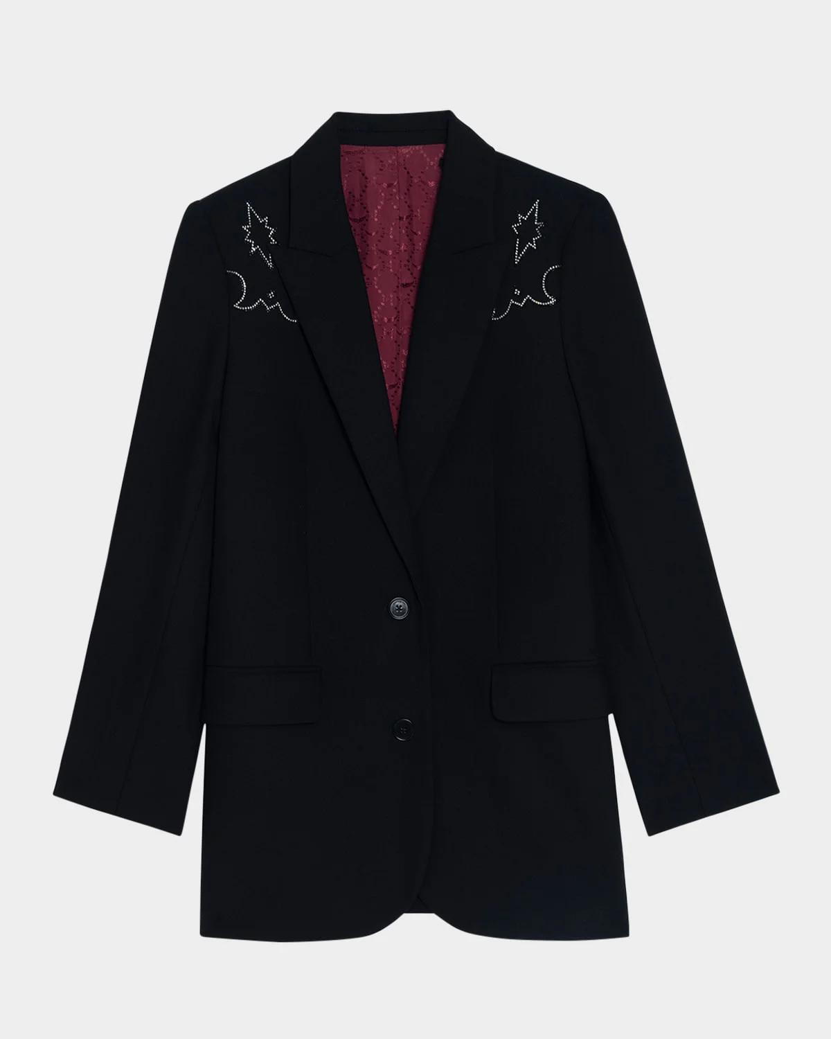 - An elevated take on a classic silhouette, the Viva blazer by Zadig & Voltaire is embellished with rhinestones in a western-inspired design - Peak lapels; single-button front - Long sleeves - Hip flap pockets - Relaxed fit - Mid-length - Polyester/viscose/elastane - Dry clean - Imported
