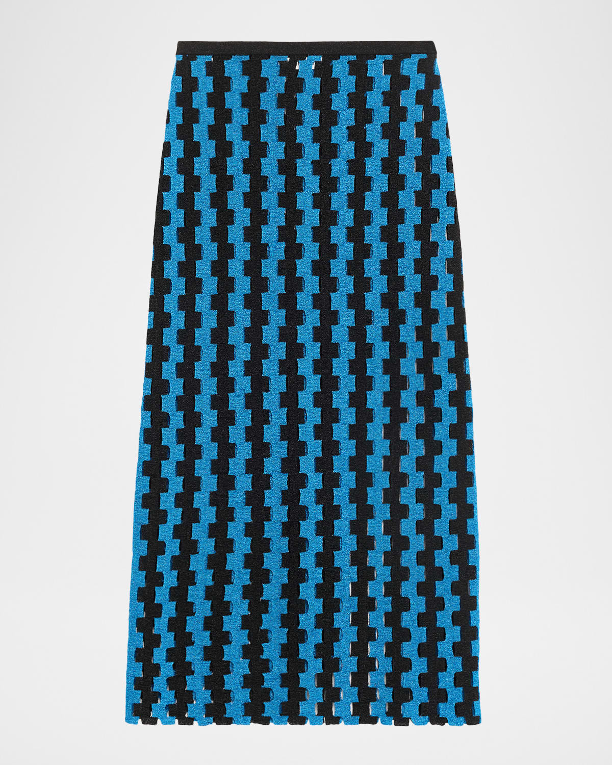 - ZANKOV "Marshall" skirt is crafted of an artfully metallic open knit - Mid waist - Full length - Pencil silhouette - Pull-on style - Polyester/Lurex® metallic fibers - Imported - Proposition 65 warning for California residents