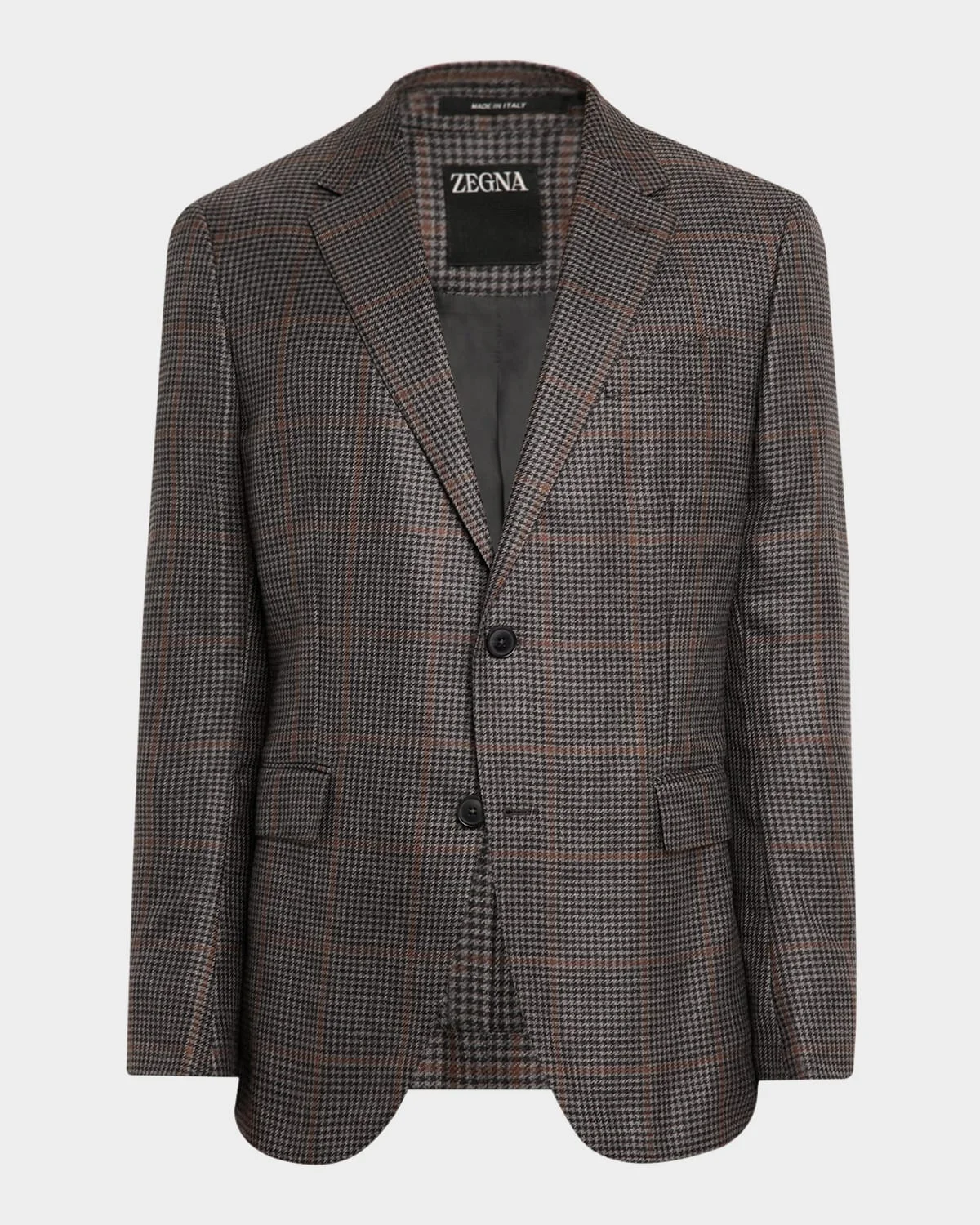 ZEGNA sport coat in lustrous cashmere and silk, accented with a timeless houndstooth windowpane pattern Notched lapels Single-breasted front Barchetta chest pocket Internal breast pocket Hip flap pockets Double-vented back Cashmere/silk Unlined Dry clean Made in Italy