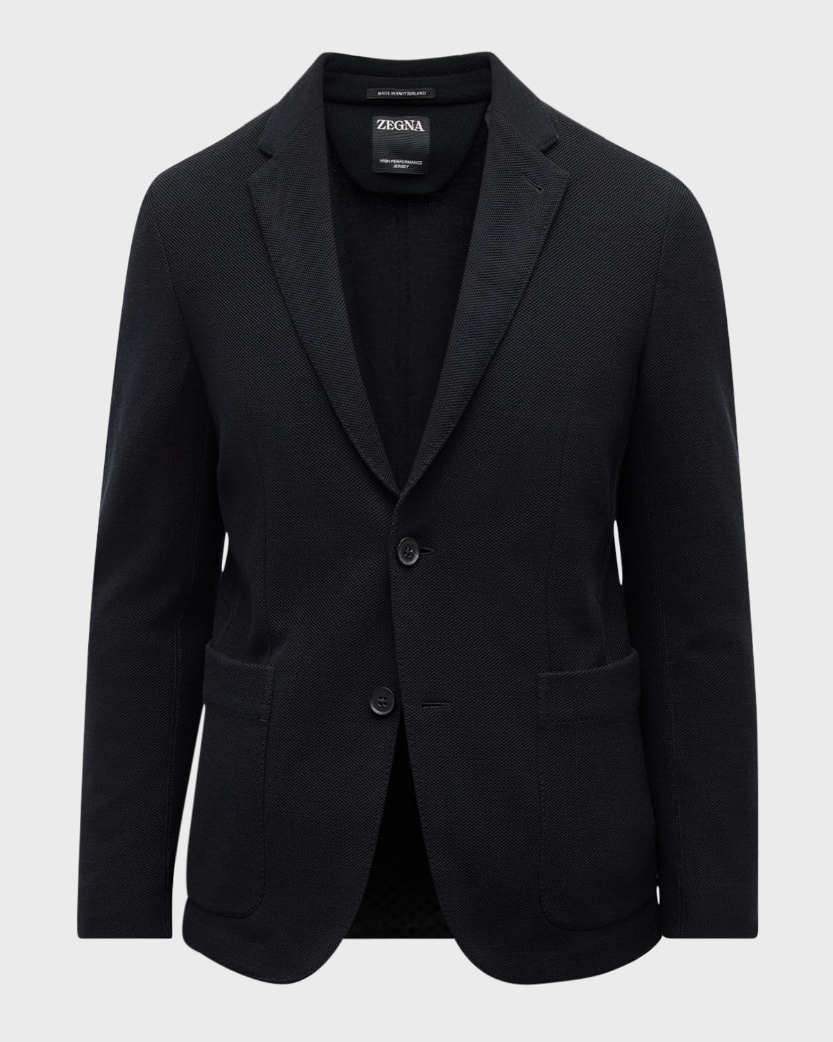 - ZEGNA sport coat in solid honeycomb high-performance jersey - Notched lapels - Two-button front - Hip patch pockets - Internal breast pocket - Long basted sleeves - Double-vented back - Wool/cotton/polyester - Lining: Cotton/cupro - Dry clean - Made in Italy - Model is 6'1"/185cm.
