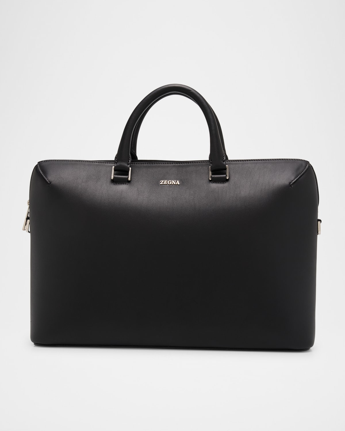 - ZEGNA business bag in calf leather with glazed silvertone hardware - Logo hardware on the front - Detachable adjustable shoulder strap - Two rolled top handles - Zip closure - Interior, one zip pocket - Dark grey polyester lining - Approx. 11"H x 15.7"W x 3.1"D - Made in Italy