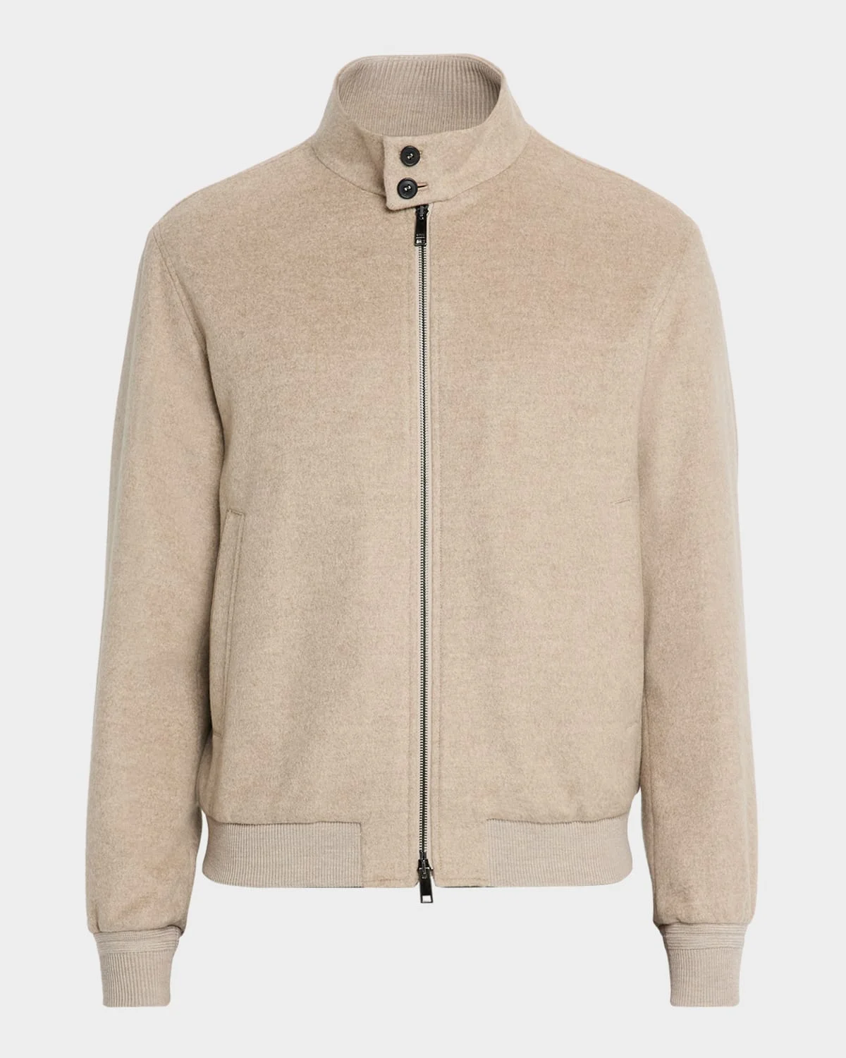 Soft and exclusive cashmere is given a waterrepellent upgrade, making this blouson by ZEGNA a reliable allweather companion. Stand collar; button closure Zip front Front slant pockets Ribbed hem and cuffs Leather back neck accent Lining: Wool/silk/cashmere/cupro Dry clean Made in Italy