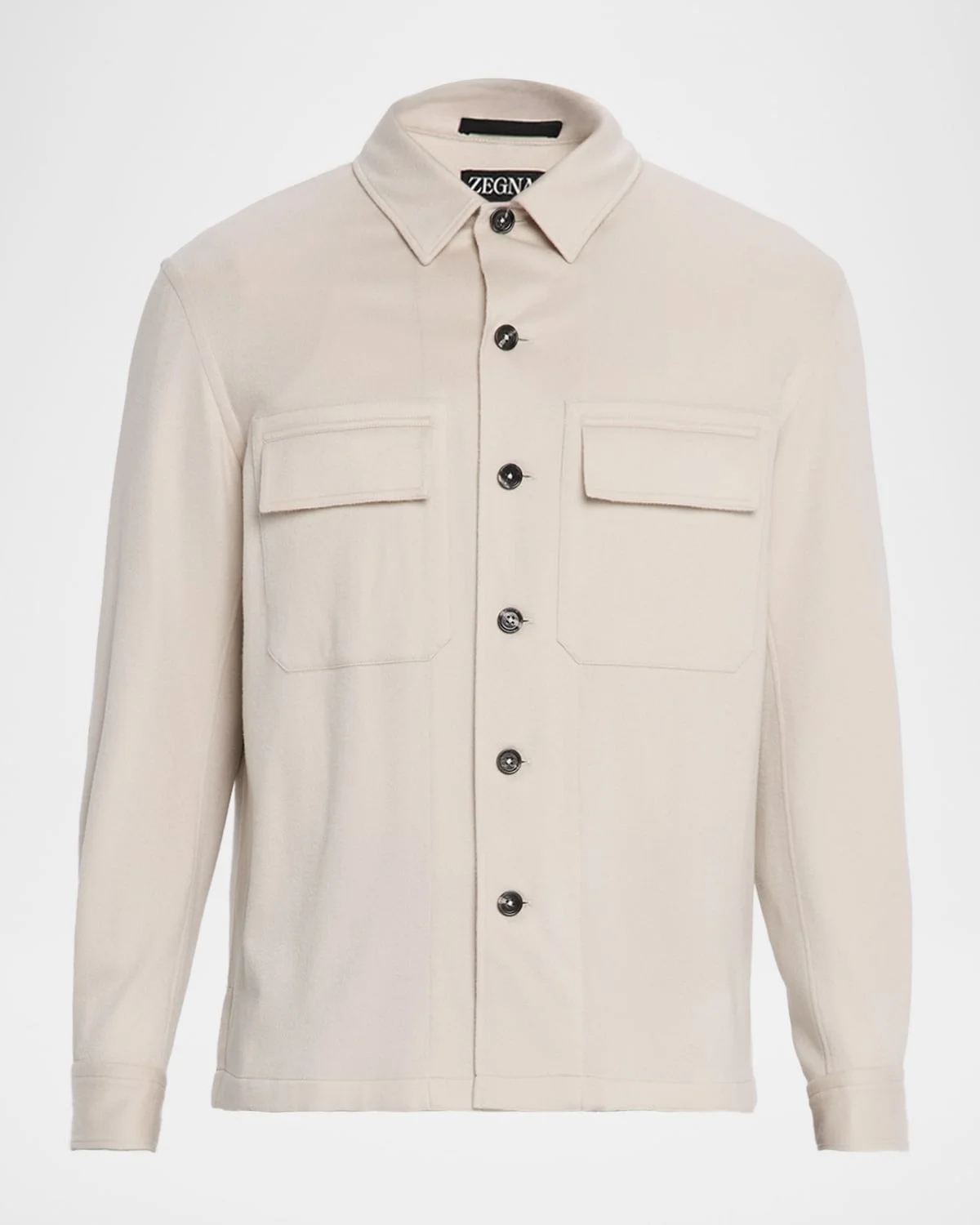 ZEGNA overshirt from the Oasi Cashmere collection crafted from cashmere of uncompromising quality and softness Point collar Button front Chest flap pockets Long sleeves Single-button cuffs Reinforced elbows Vented sides Cashmere/leather Lining: Polyester Dry clean Made in Italy Model is 6'1"/185cm.
