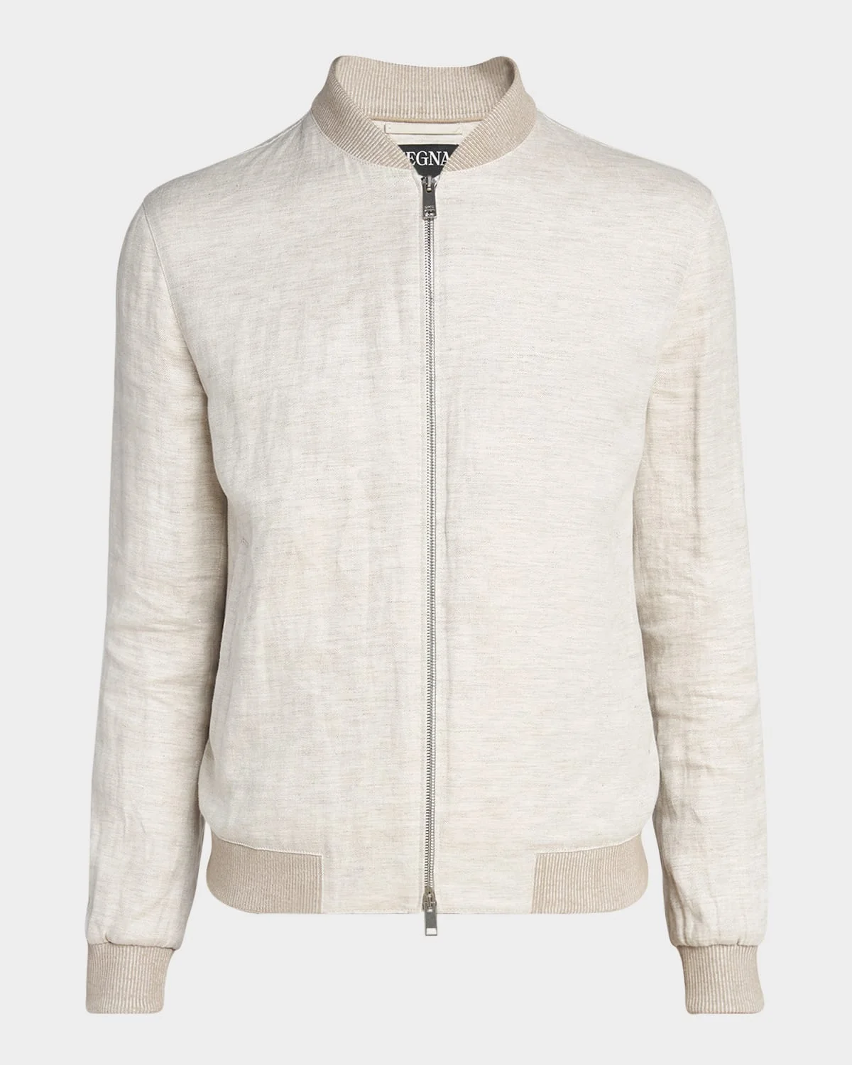 ZEGNA bomber jacket from the Oasi Lino collection Rib-knit collar, cuffs and waistband Two-way zip closure Side welt pockets Long sleeves Linen Lining: Silk/cotton Details: Calf leather Dry clean Made in Italy Oasi Lino garments are woven from European-grown flax fibers as part of Zegna's commitment to sustainable, traceable production methods.