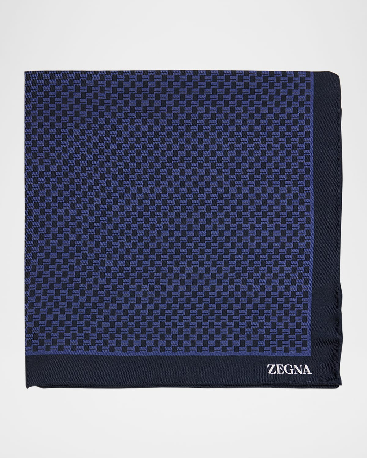 - ZEGNA pocket square in silk, showcasing a small rectangular geometric print - Contrast border - Logo on the corner - May be styled multiple ways - Silk - Do not iron, dry clean - Made in Italy