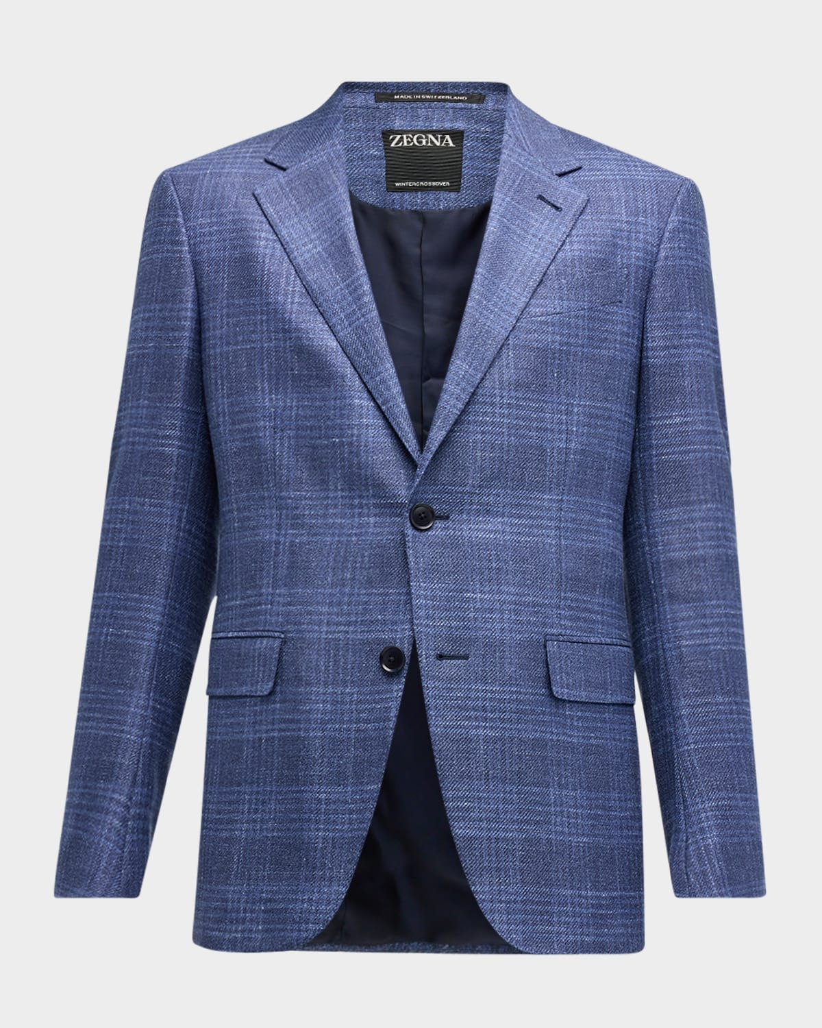 - ZEGNA sport coat in soft, breathable Crossover plaid - Notched lapels - Two-button closure - Chest welt pocket - Side patch pockets - Interior welt pocket - Unfinished sleeves - Double-vented back - Wool/silk/linen - Dry clean - Made in Italy - Model is 6'1"/185cm.