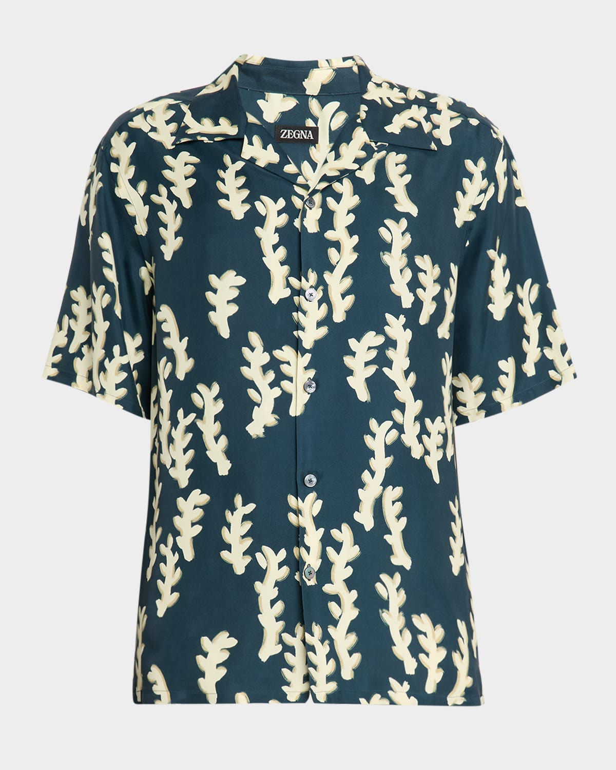 - ZEGNA camp shirt in lustrous silk showcasing the signature Oasi print - Cuban collar - Button front - Short sleeves - Vented sides - Straight hem - Silk - Dry clean - Made in Italy