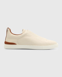 - ZEGNA showcases its unique approach to design with these Triple Stitch sneakers that feature hidden laces for an offbeat finish. - ZEGNA low-top sneakers with grained deerskin leather upper - Flat heel - Round toe - Crisscross elasticized vamp - Debossed logo at tongue - Padded collar - Pull tab at backstay - Embossed logo at heel counter - Slip-on style - Rubber outsole - Leather lining - Made in Italy - Size Note: Recommend sizing down a ½ size. Please note that ZEGNA uses UK sizing.