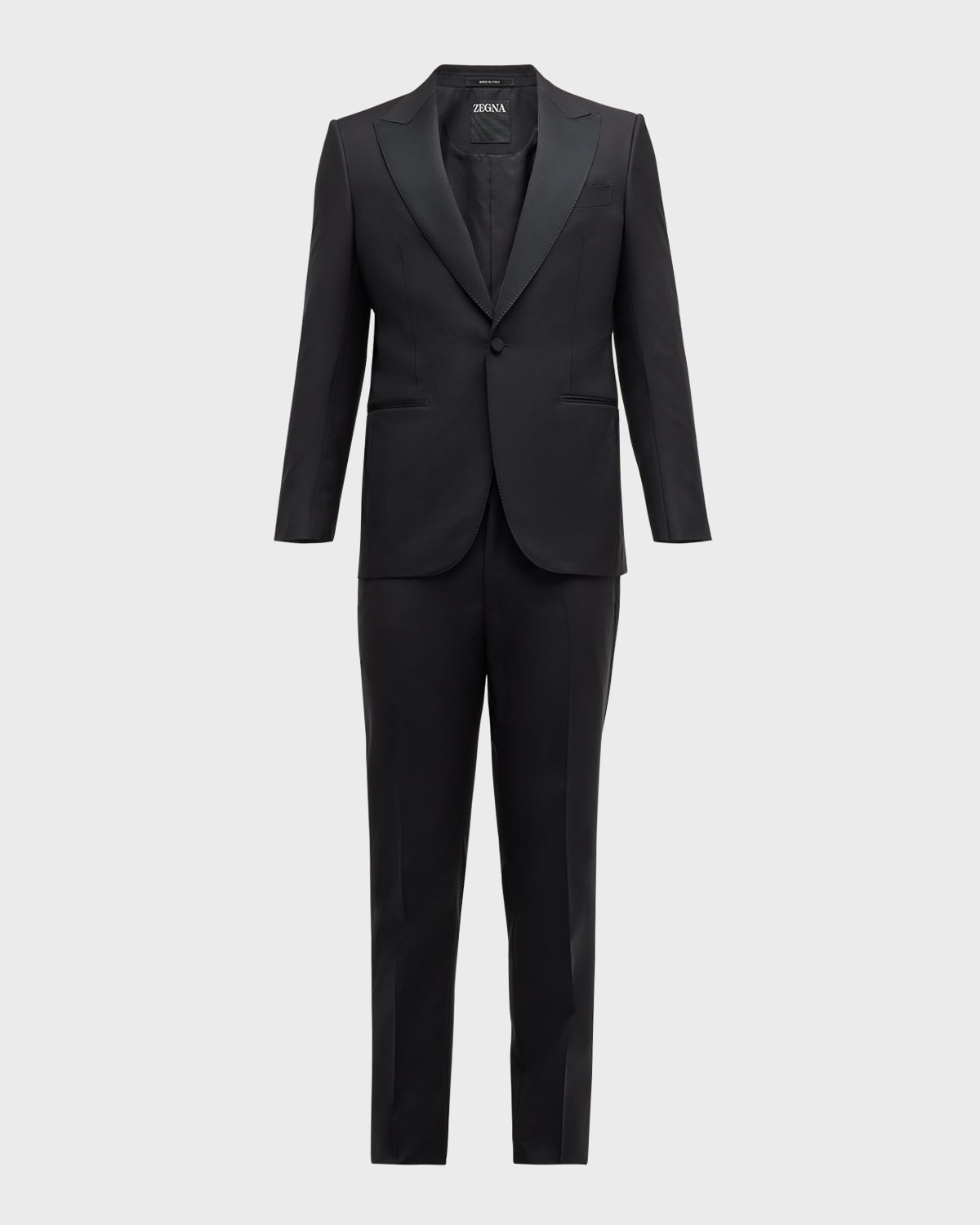 - ZEGNA solid tuxedo - Peak lapels; single-button closure - Chest welt pocket - Jetted hip pockets - Straight-leg trousers - Unfinished hem to be tailored to desired length - Wool/mohair - Dry clean - Made in Italy - Model is 6'1"/185cm. - Size Note: Item runs small, consider ordering a size up.