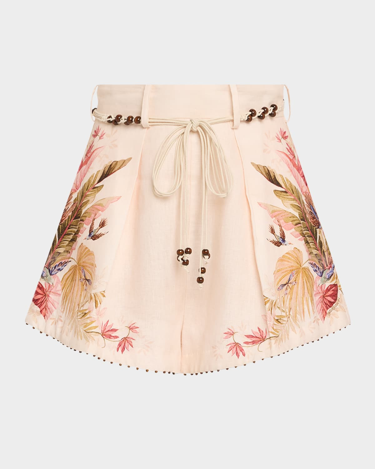 - Zimmermann "Ascension" floral-print linen shorts with beaded trim - High rise - Beaded self-tie belt - Pleated front - Tailored fit - Center back zip; belt loops - Linen - Lining: Cotton - Dry clean - Imported - Size conversion: - 0 = X-Small, 1 = Small, 2 = Medium, 3 = Large