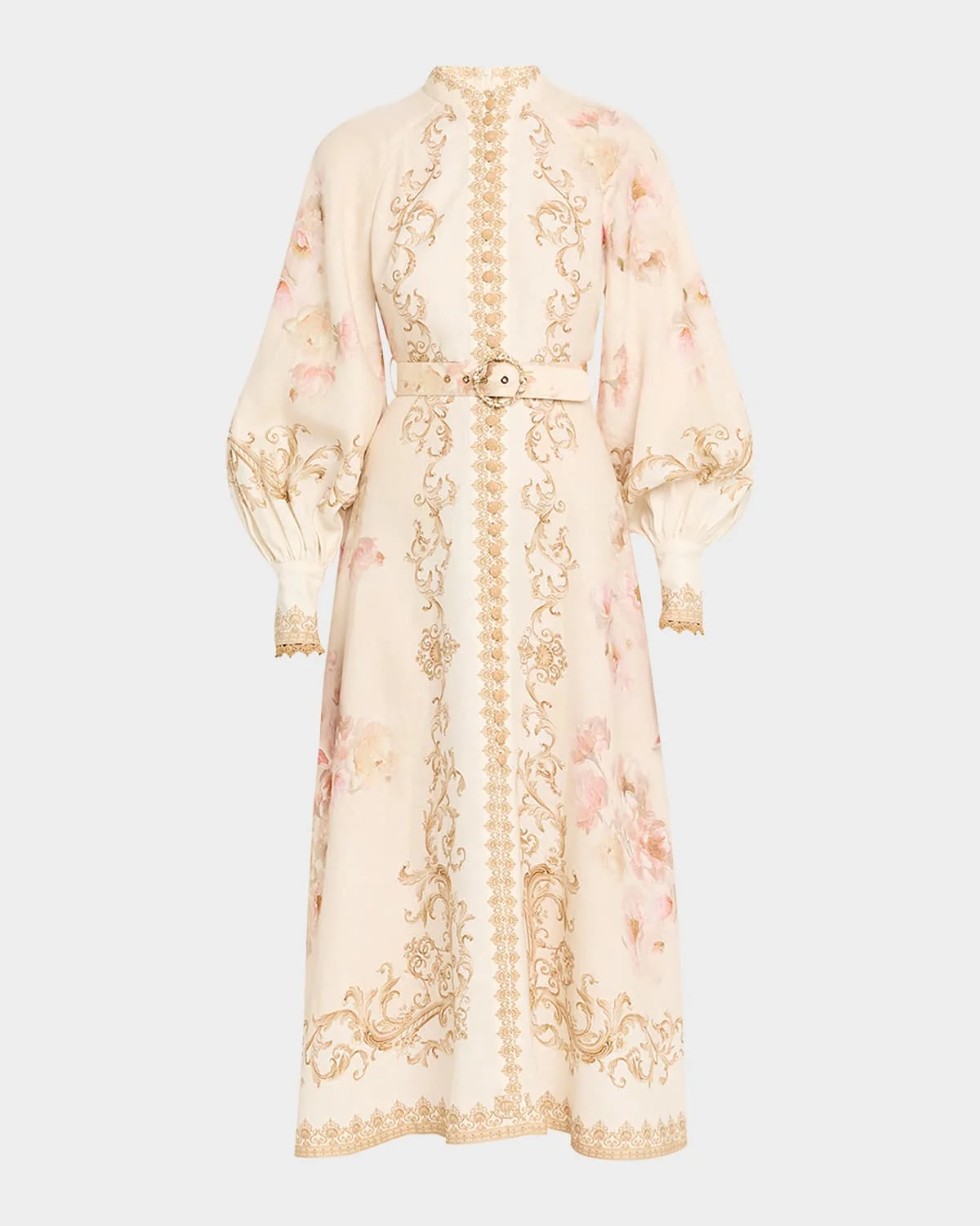 Zimmermann linen midi dress decorated in an intricate floralscroll print High neckline; buttonfront Long raglan sleeves with button cuffs Belted waist Shirtdress silhouette Hem falls below the knee Linen Unlined Dry clean Imported