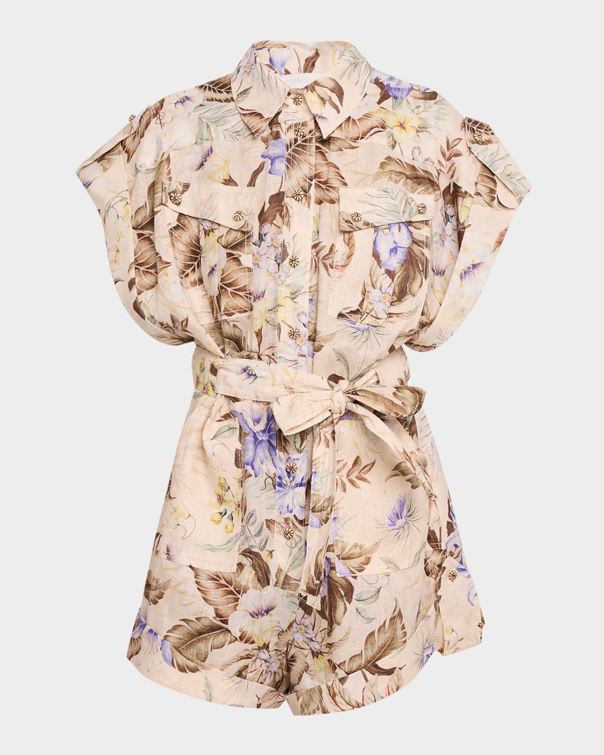 - Zimmermann "Coco" tropical-print linen playsuit finished with a self-tie waist for added shape - Point collar - Short cuffed sleeves - Dual chest pockets - Button-front bodice - Front patch pockets - Cuffed hem - Step-in style - Linen - Unlined - Dry clean - Imported - Size conversion: - 0 = X-Small, 1 = Small, 2 = Medium, 3 = Large