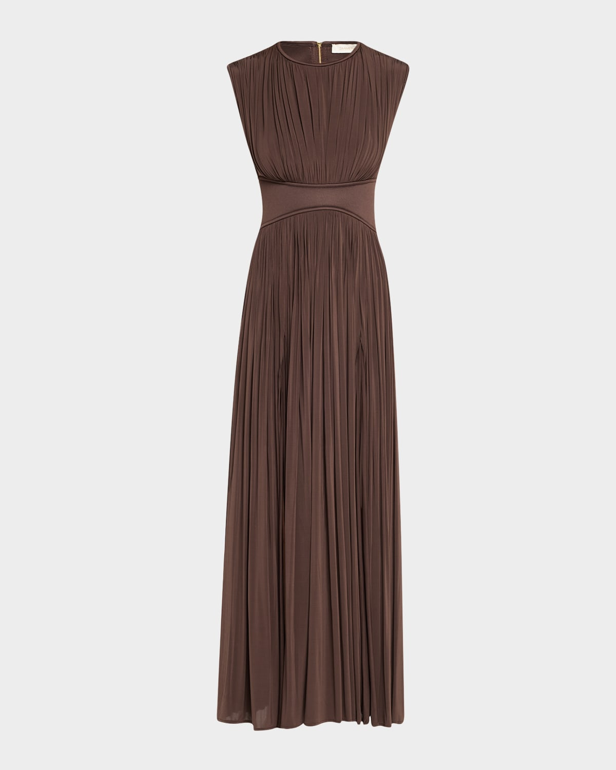 - Zimmermann "Illuminate" gathered satin dress enhanced with a defined waist - High round neckline - Sleeveless - Column silhouette - Full length; front slits - Center back zip - Viscose/elastane/polyester - Dry clean - Imported - Size conversion: - 0 = X-Small, 1 = Small, 2 = Medium, 3 = Large