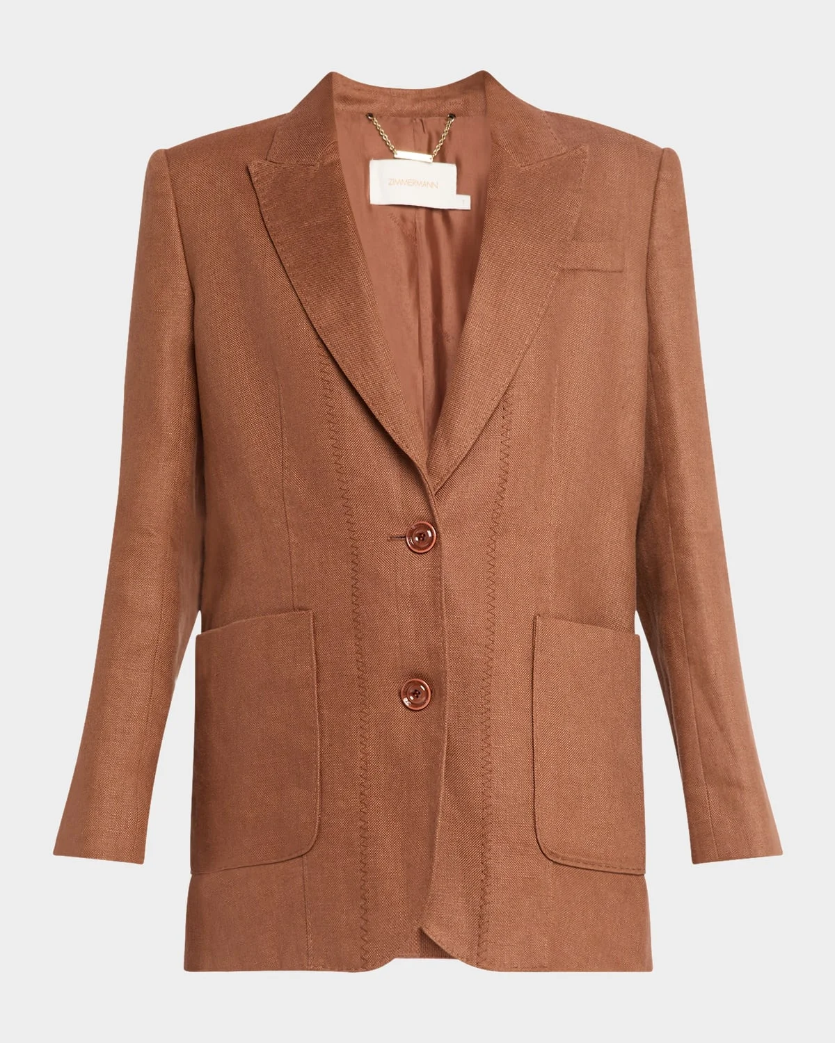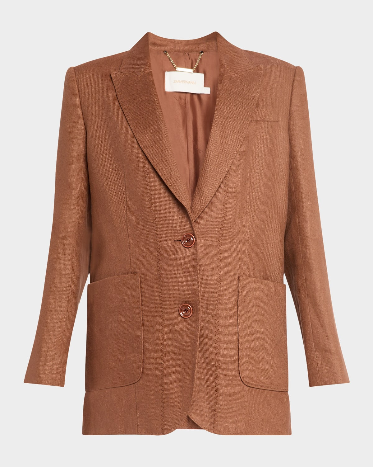 - Zimmermann "Illuminate" linen jacket featuring tonal blanket stitching - Notch lapels - Single-breasted front - Long sleeves with button cuffs - Chest welt pocket - Hip flap pockets - Tailored fit - Vented back - Button-front - Linen - Lining: Viscose/silk - Dry clean - Imported - Size conversion: - 0 = X-Small, 1 = Small, 2 = Medium, 3 = Large