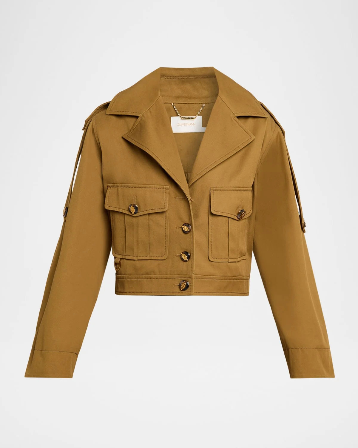 Crafted of cotton drill, this cropped Luna cargo jacket from Zimmermann features button-through flap pockets.Notched lapelsEpaulettesLong sleeves, belted cuffsSide button-through flap pocketsButton-front closureCottonLining: viscose/silkDry cleanImportedSIZE & FITModel measurements: 5 & apos;10" tallModel is wearing a US size Small/4Size conversion: 0 = X-Small, 1 = Small, 2 = Medium, 3 = LargeSIZE & FIT Model measurements: 5 & apos;10" tall Model is wearing a US size 4/Small