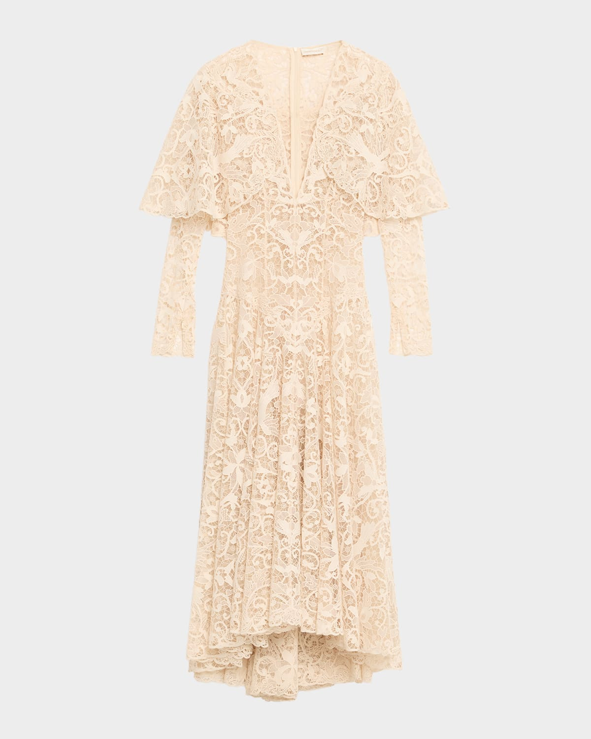 - Zimmermann "Memento" intricate lace dress elevated with a plunging V neckline and corset-style bodice - Long sleeves - Fit-and-flare silhouette - Hem falls below the knee - Center back zip - Polyester - Unlined - Dry clean - Imported - Size conversion: - 0 = X-Small, 1 = Small, 2 = Medium, 3 = Large
