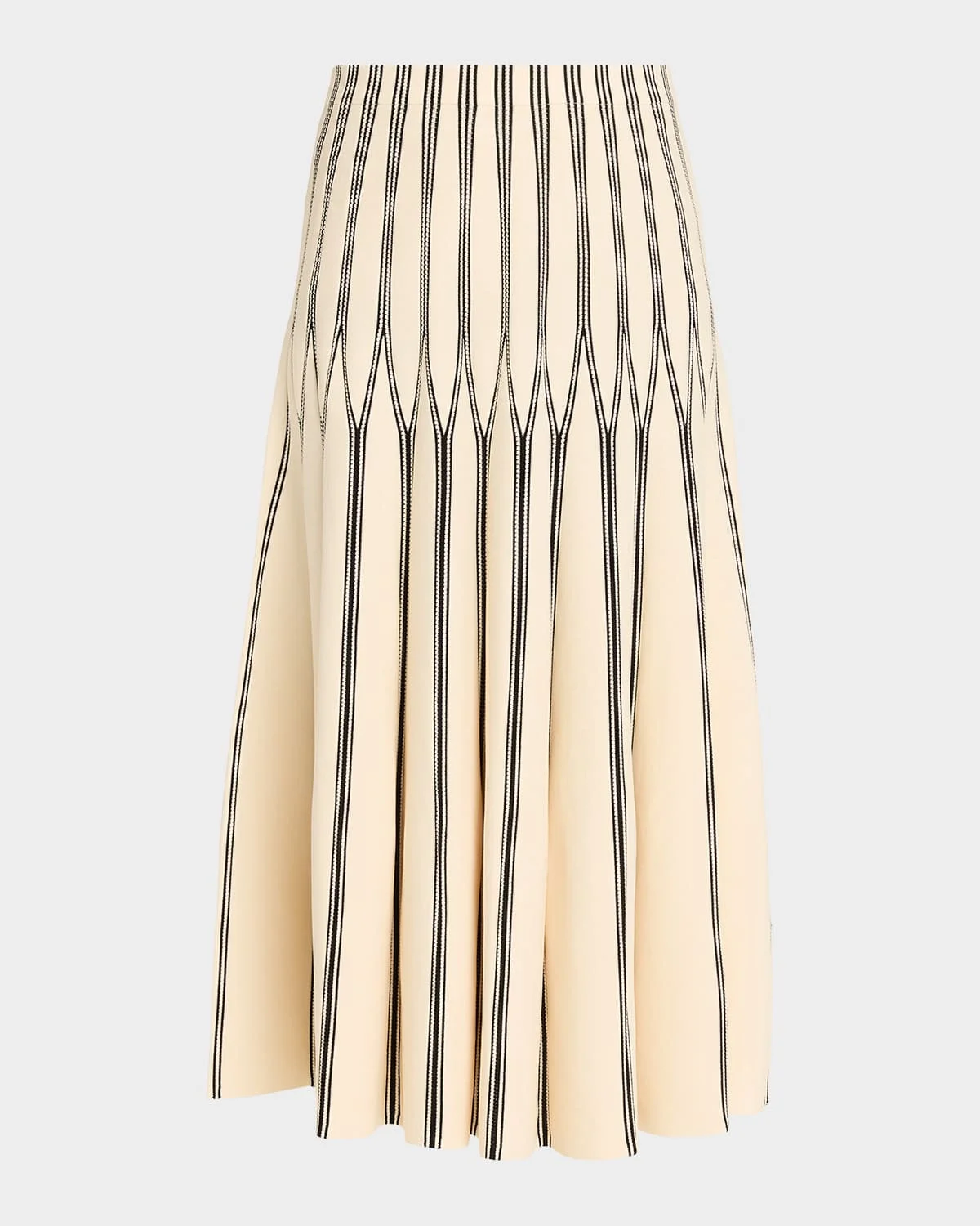 Zimmermann "Rebellion" compact knit midi skirt detailed with deep pleats defined by contrast stitching & nbsp; Mid-rise; sits high on the hip Elastic waistband Skirt falls straight from hip to hem Full length Pull-on style & nbsp; Viscose/elastane Dry clean Imported Size conversion: 0 = X-Small, 1 = Small, 2 = Medium, 3 = Large SIZE & FITModel measurements: 5 & apos;10" tallModel is wearing a US size 4/Small