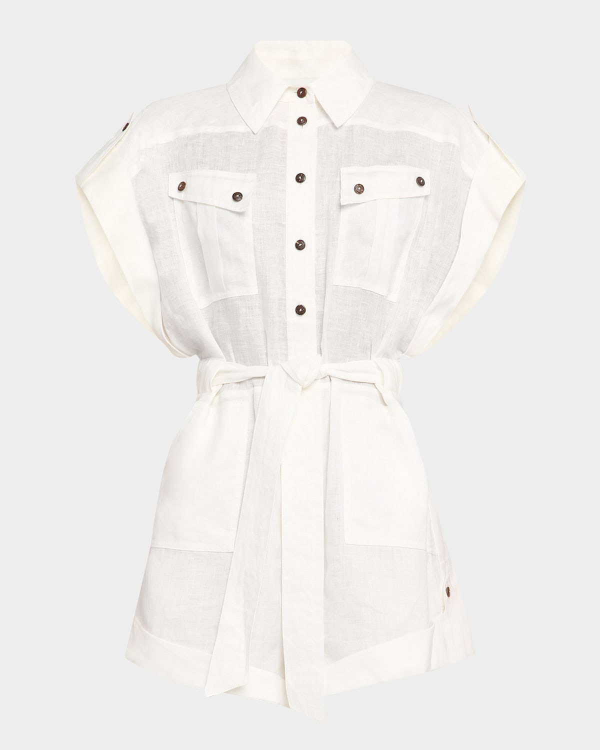 - Zimmermann "Rhiannon" linen romper finished with cuffed sleeves and hem - Point collar; button-front - Epaulets - Short sleeves - Dual chest pockets - Self-tie belt - Front patch pockets - Classic fit - Step-in style - Linen - Lining: Cotton - Dry clean - Imported - Size conversion: - 0 = X-Small, 1 = Small, 2 = Medium, 3 = Large