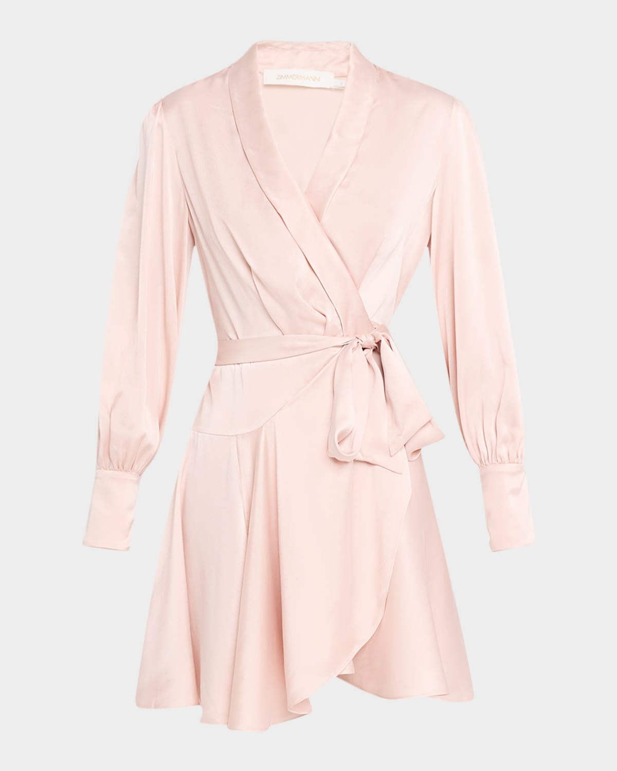 - Crafted from luxurious silk, this Zimmermann mini dress features an adjustable wrap front that exudes feminine elegance. - V neckline - Long sleeves with button cuffs - Wrap silhouette - Hem falls above the knee - Side tie closure - Silk - Dry clean only - Imported - Size conversion: - 0 = X-Small, 1 = Small, 2 = Medium, 3 = Large