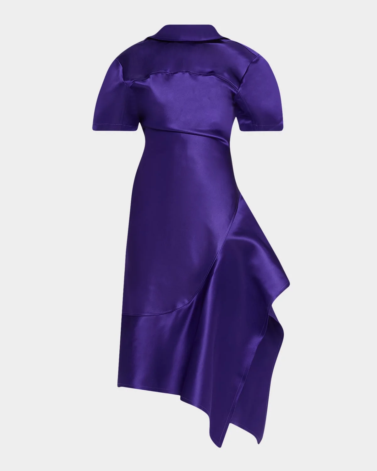 Crafted from lustrous satin, the "Dahl" dress from Zomer is tailored with a reversed effect, low V back, and an asymmetric hem with an arched side slit High neckline Short sleeves Sheath silhouette Hem falls below the knee Invisible back zip Silk Made in Hungary