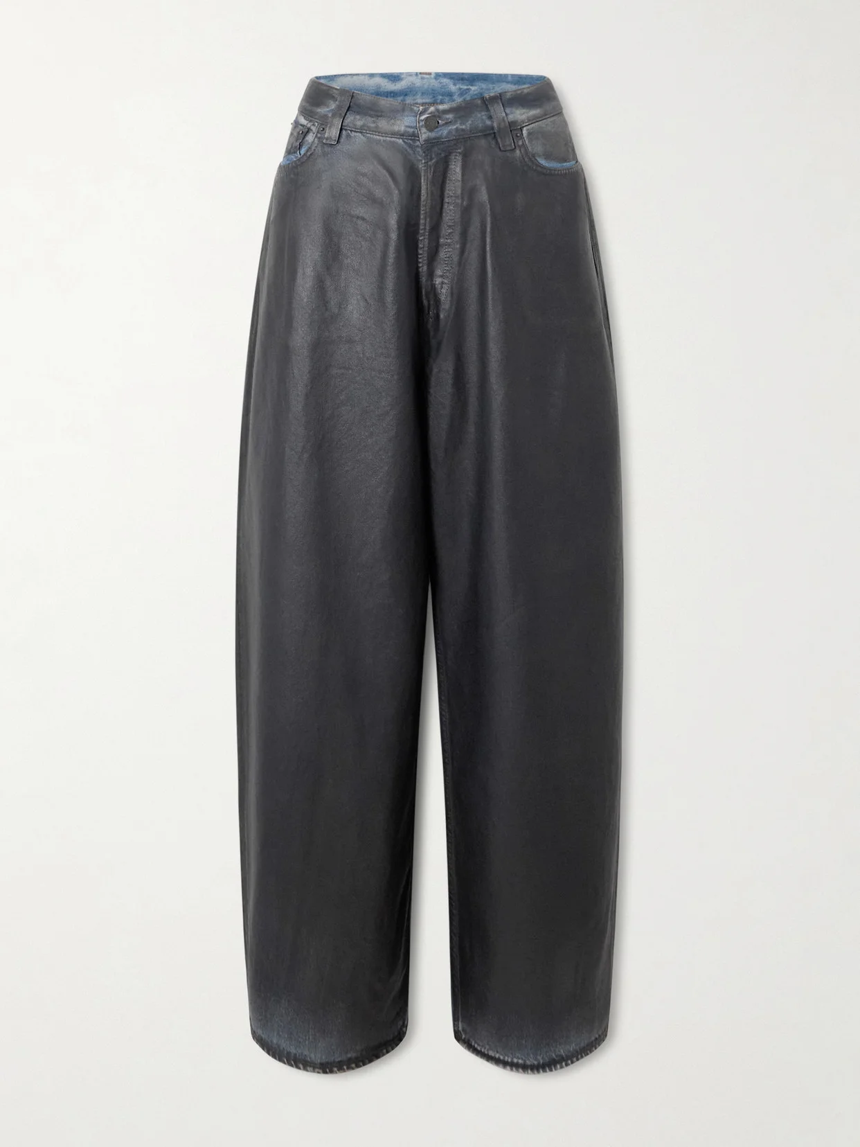 Acne Studios' '2023' jeans are made from faded denim that's partially coated to resemble leather. Designed to sit low on the hips, they have a classic five-pocket construction and wide, baggy legs that skim the floor. The label's logo patch details the back.
