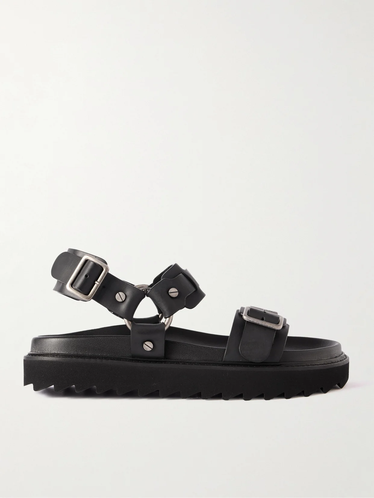 There's a cool, slightly punk feel to Acne Studios' sandals. They're crafted from supple leather, accented with thick buckles and studs and embossed with the label's logo. The chunky platform soles and substantial straps feel comfortably secure. This product was created using Considered Processes. Find out more about NET SUSTAIN here.