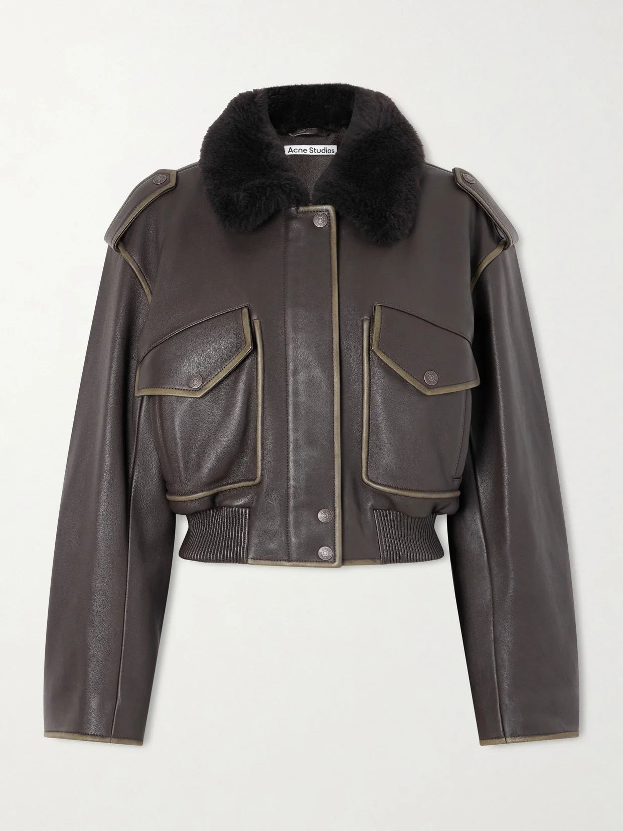 Acne Studios reimagines the classic bomber jacket through a pared-back, modern lens. Made from leather with a plush shearling collar, it has a relaxed silhouette that is defined by a utility pocket and ribbed trims. Style it with wide-leg denim or pants to underscore the clean lines.