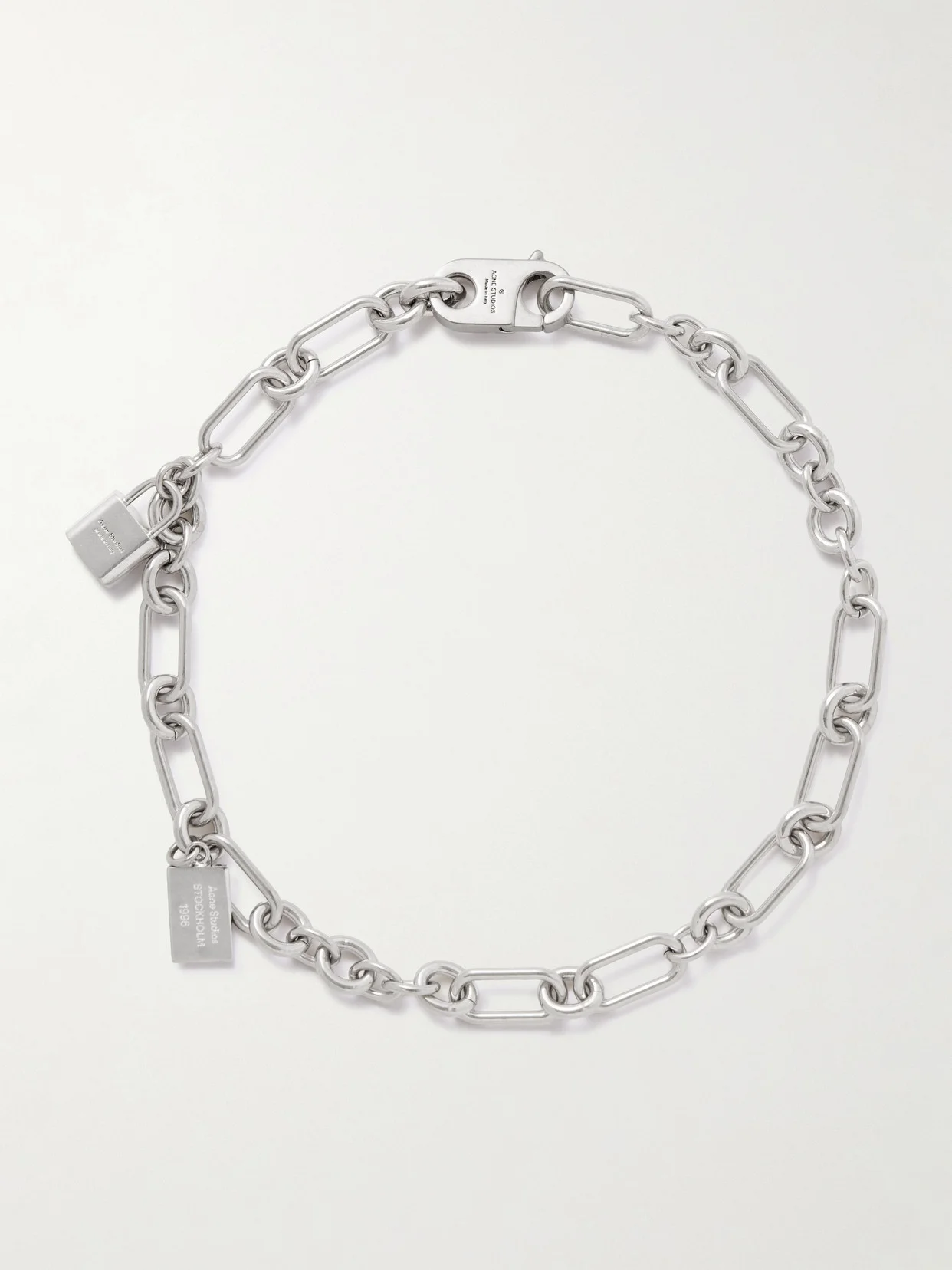 Acne Studios' necklace distils the brand's cool, industrial sensibility into a single statement piece. Cast from silver-tone metal, it features elongated links finished with a padlock charm and a signature '1996' logo tag. Wear yours solo over a simple tee or layered with finer chains.