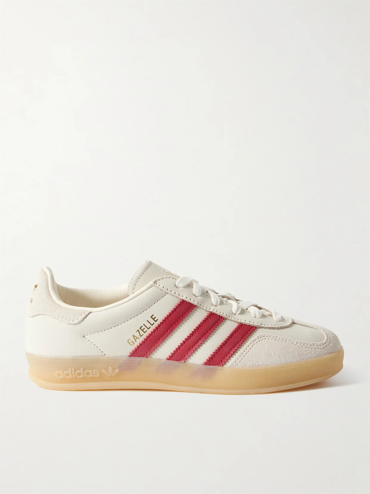 adidas Originals' 'Gazelle Indoor' sneakers were initially released in the '70s as an indoor sports shoe and have since grown to become an iconic streetwear staple. This iteration is made from leather and suede with red stripes and gummed rubber soles.