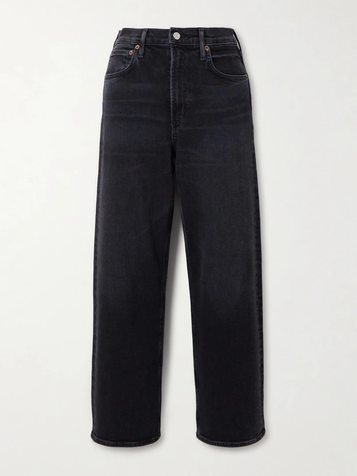 AGOLDE's 'Ren' jeans will soon become your go-to pair for casual days. Made from dark-grey denim, they have a high rise waist and wide legs. Half-tuck a tee into yours. Lower-Impact Materials. This product is made using at least 50% lower-impact materials or ingredients. Find out more about our NET SUSTAIN criteria here.