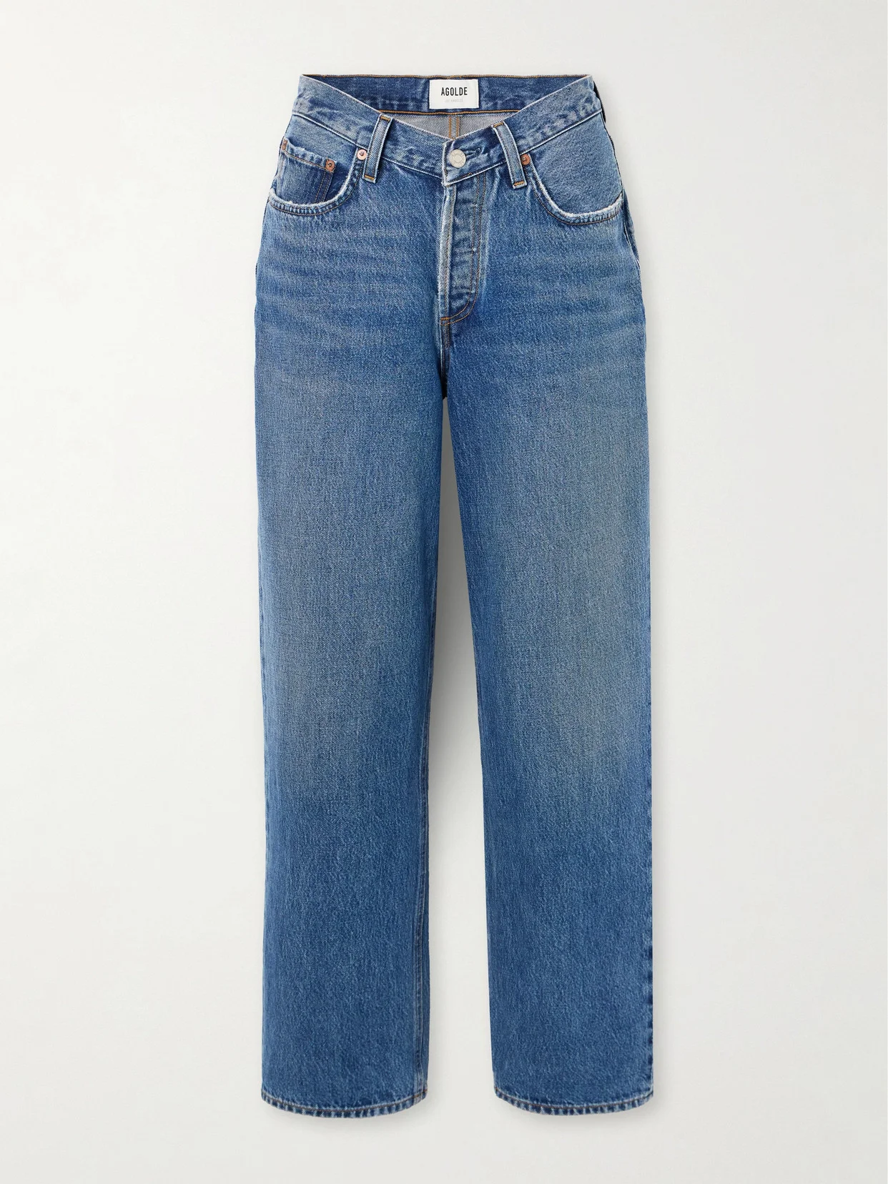 AGOLDE's 'Baggy' jeans are designed with a V-shaped mid-rise waist that draws the eye inward and emphasizes your curves. Made from 'Eco-Indigo' denim in a gently faded 'Cascade' wash, they have straight legs and a classic five-pocket construction. Lower-Impact Materials. This product is made using at least 50% lower-impact materials or ingredients. Find out more about our NET SUSTAIN criteria here.