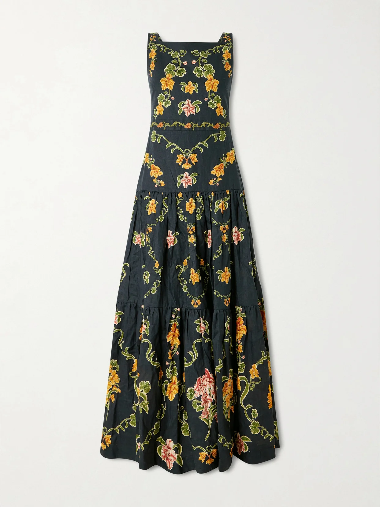 Agua by Agua Bendita's 'Abeja' dress is made from breathable linen, printed and embroidered with beads to showcase fairytale-like florals. The pinafore-style square neckline and tiered maxi skirt add elegance.