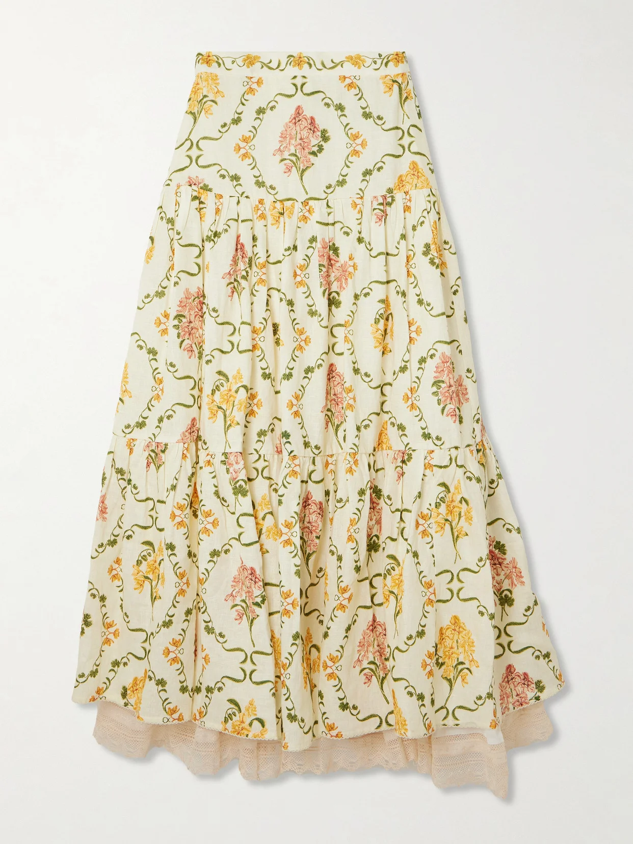 Anis Cordillera Tiered Lace-trimmed Floral-print Linen Maxi Skirt