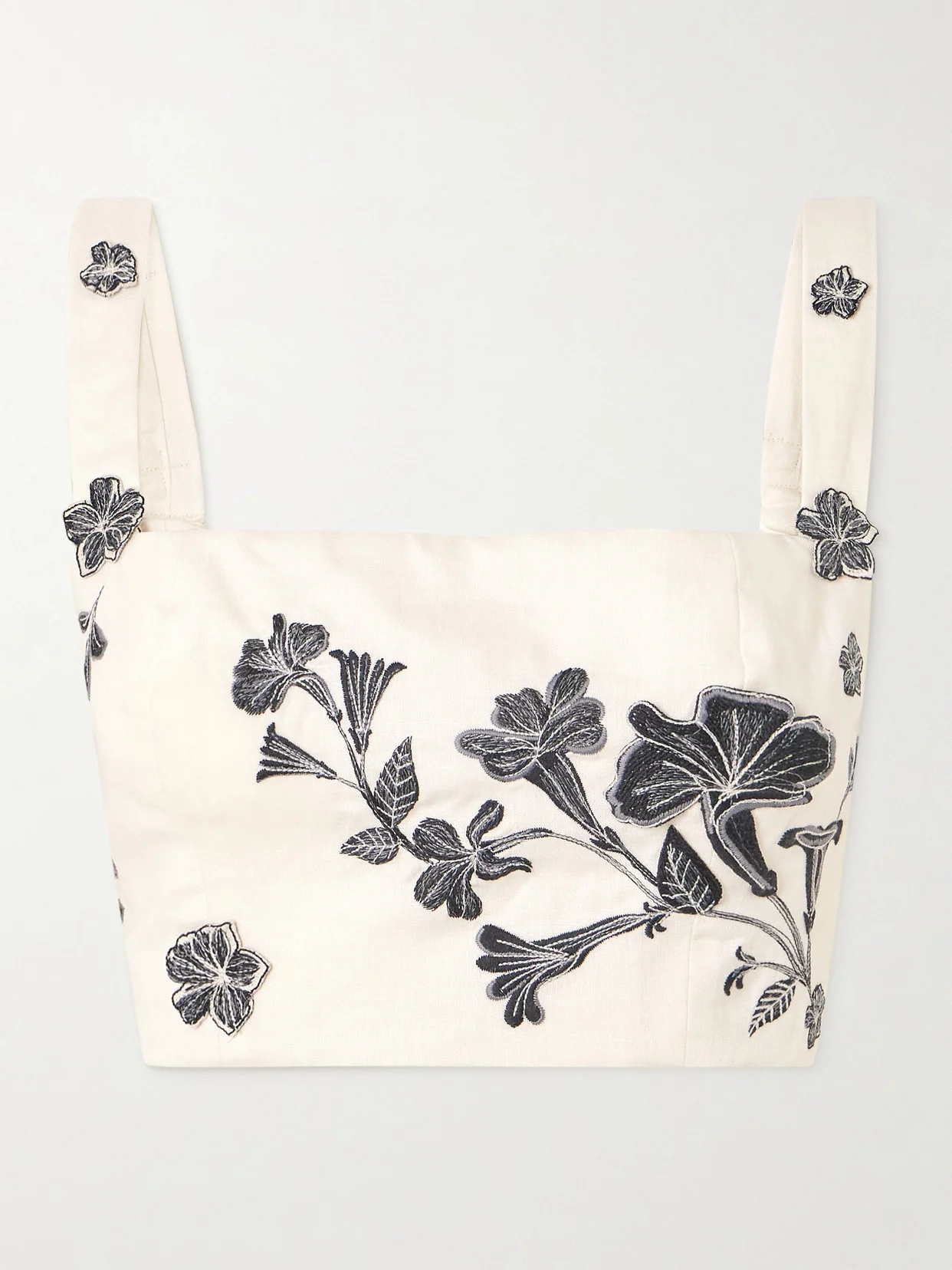 Cacao Guayacan Cropped Appliquéd Embroidered Linen Top