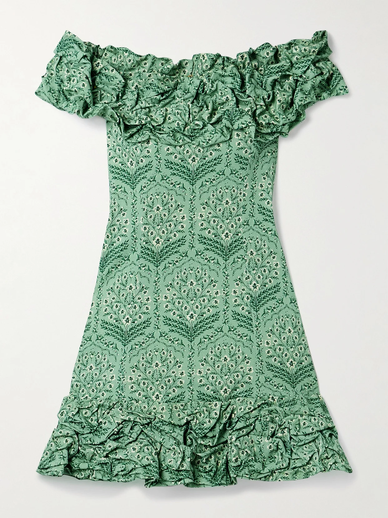 Agua by Agua Bendita co-founders Mariana Hinestroza and Catalina Alvarez grew up in the salsa capital of the world, and that influence is portrayed so beautifully in their designs. This 'Jardin' dress is cut from cotton-blend printed with tonal-green flowers and has ruffles tracing the off-the-shoulder neckline and mini hem.