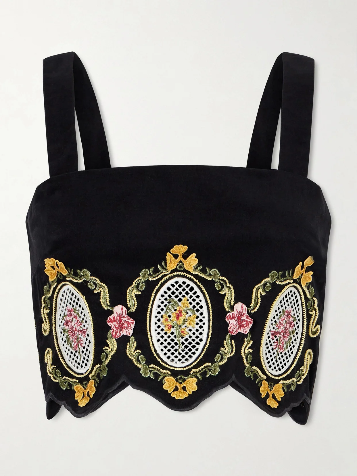 Agua by Agua Bendita's collections are inspired by the lush beauty of Latin America and the region's rich culture. This 'Luciana Cordillera' top is made from cotton-blend velvet for a cropped fit and is beautifully detailed with ornate floral embroidery and finished with a pretty scalloped hem.
