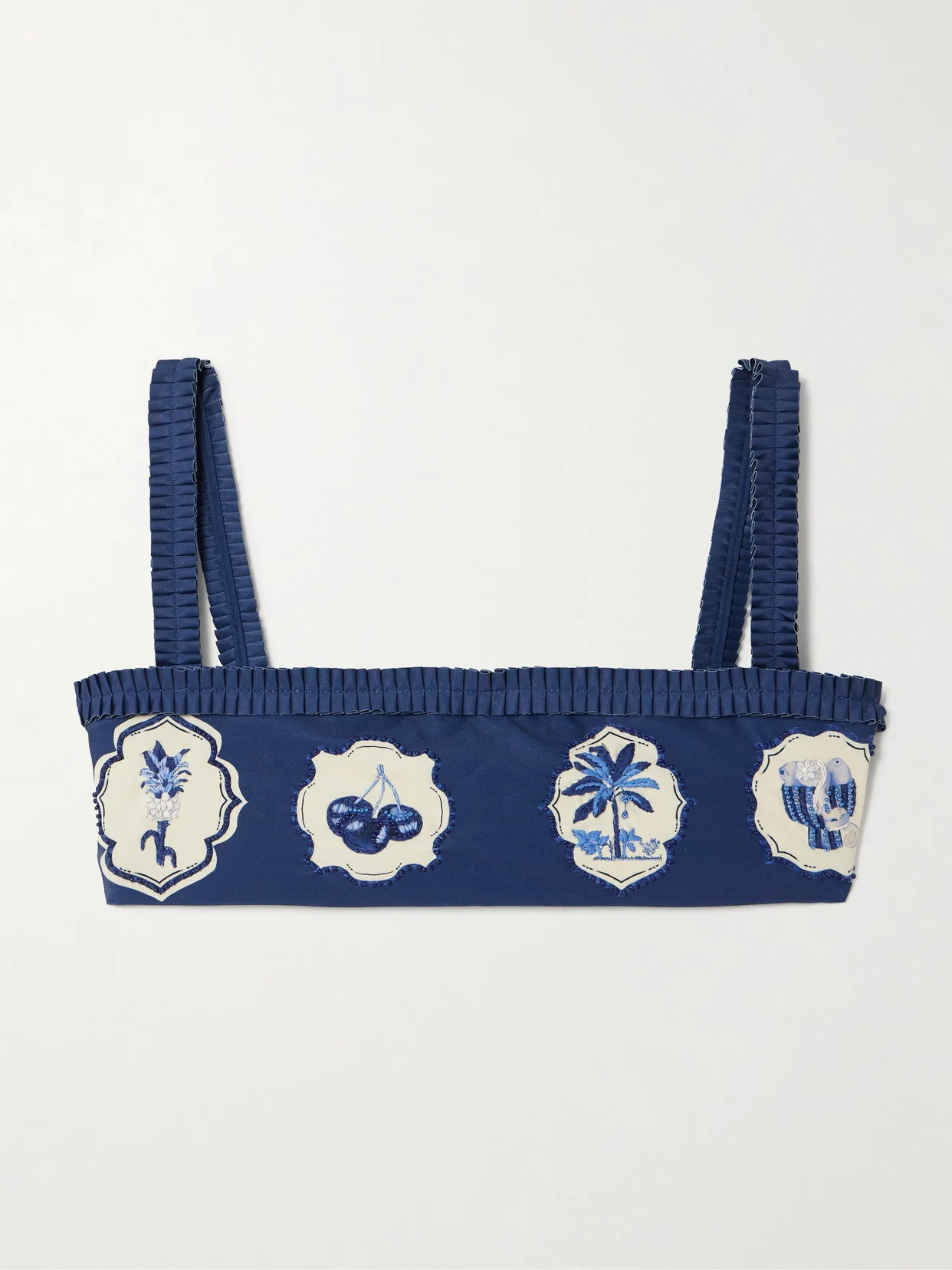 Agua By Agua Bendita's 'Olmo Wild' bikini top is hand-embroidered and beaded with tropical motifs in a process that takes six hours to complete. Made from stretchy recycled fabric, it has a square neckline traced with ruffles to match the slim straps. Style yours with the matching briefs and pareo for the full effect. Lower-Impact Materials. This product is made using at least 50% lower-impact materials or ingredients. Responsible Craftsmanship. This product promotes artisanal skills and a brand that invests in communities and adheres to fair-trade principles. Find out more about our NET SUSTAIN criteria here.