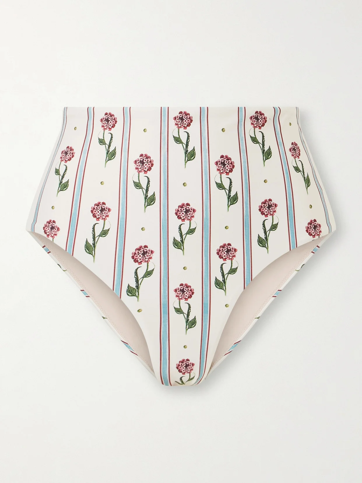Agua by Agua Bendita's bikini briefs are patterned with lush blooms and contrasting stripes - the placement highlights the full-coverage, high-waisted silhouette. Wear yours as a set with the coordinating top in our edit.