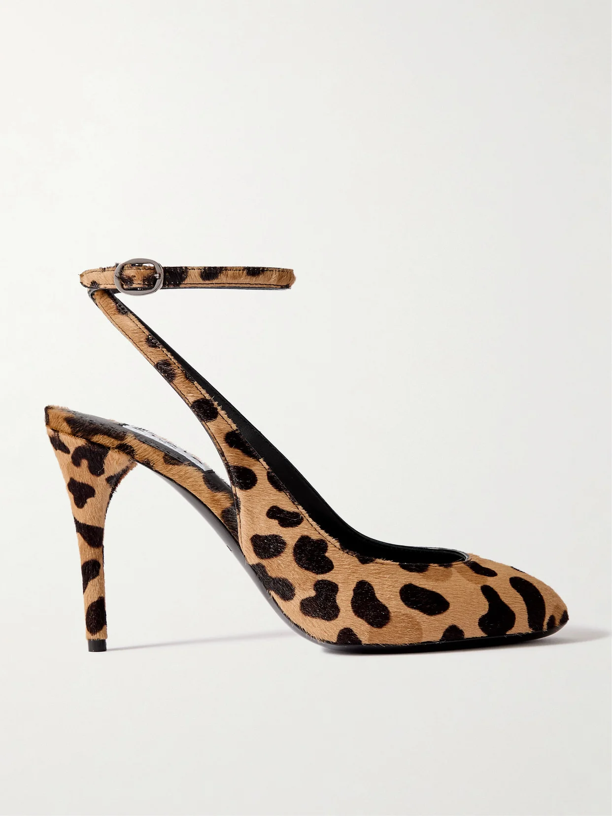Alaia's pumps have been made in Italy from tactile leopard-print calf hair - one of the season's top trends, the pattern is bold yet versatile. They're designed with slim straps that wrap around the ankles and have 90mm stiletto heels.