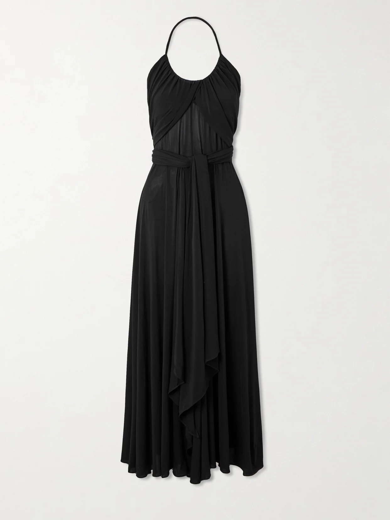 Alaia's Summer Fall '25 collection transforms clothes into kinetic sculptures, echoing the fluidity of Mark Manders' sculptures. This maxi dress is made from artfully draped jersey that's gathered at the halter neckline and has sweeping waist ties.