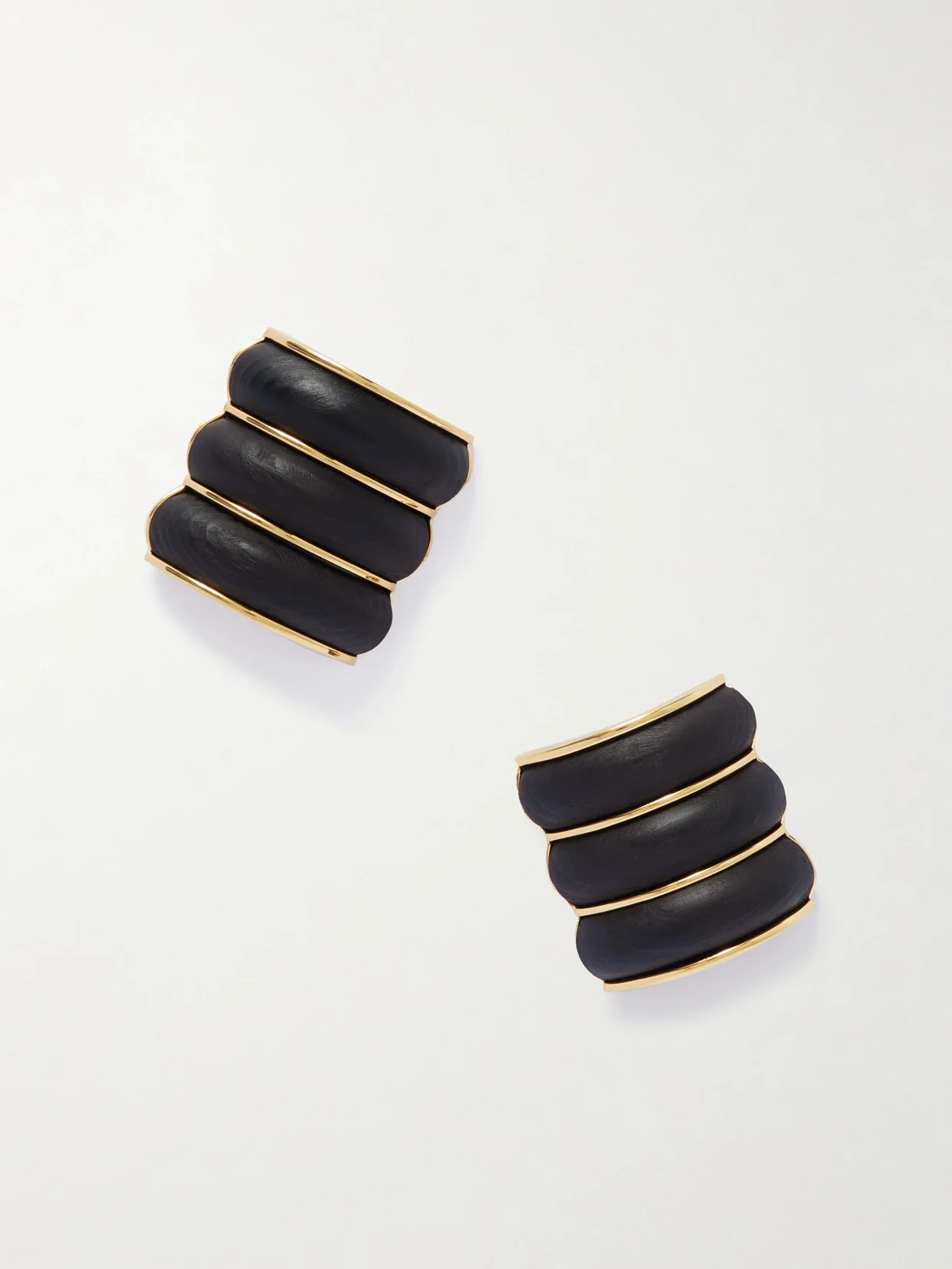 Alaia's 'Bumper' clip earrings have an oversized, artful design that brings a sculptural slant to any outfit. They're designed with three curves of blackened matte wood and edged with polished gold-tone metal.