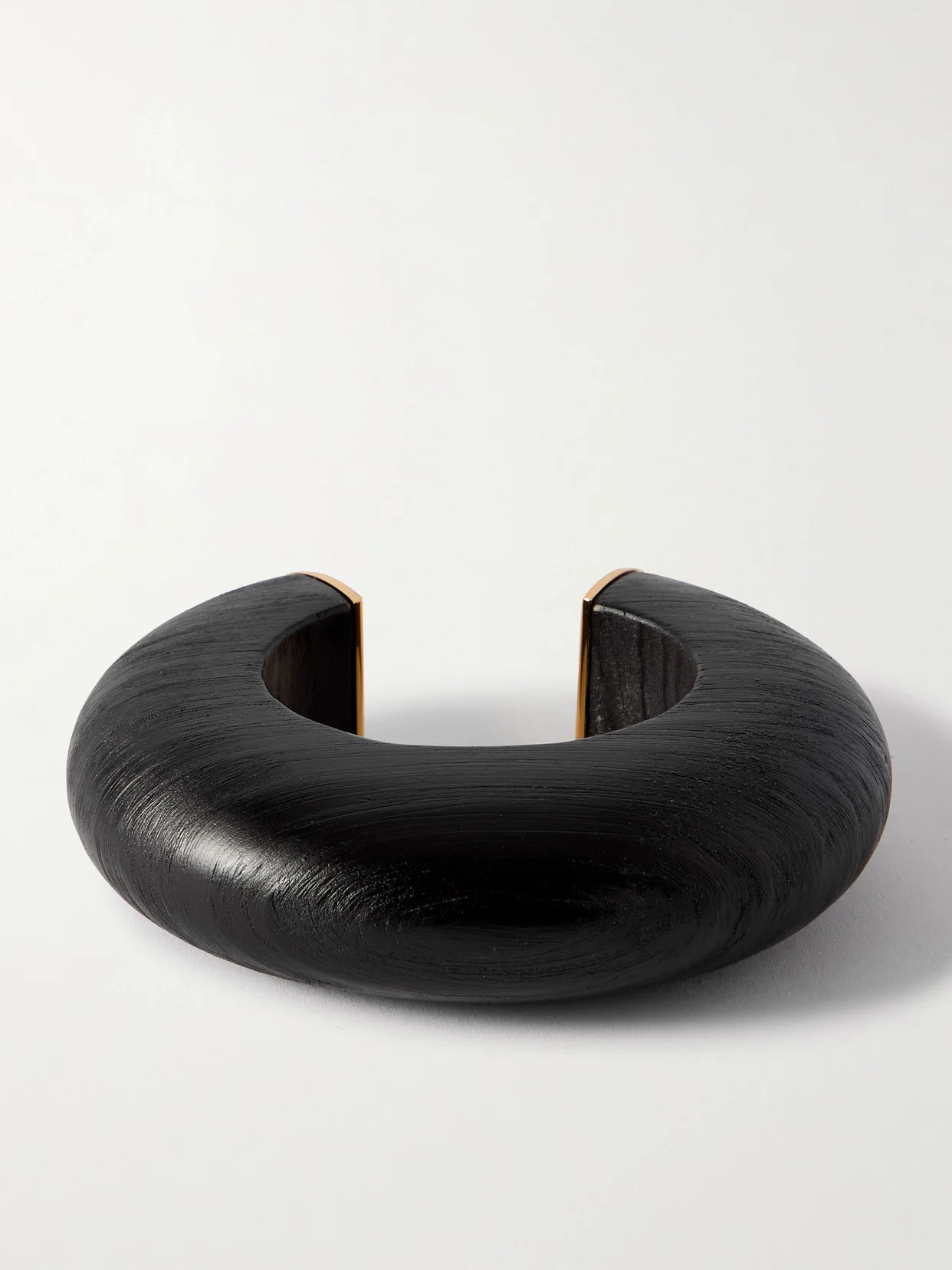 This 'Bumper' cuff pays homage to Alaia's background in sculptural design, resembling a piece of wearable art. Made in Italy from wood and brass, it has a chunky profile that looks stylish over one of the label's shirts or paired with a dress.